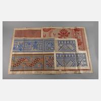 neun Stück, 1. Hälfte 20. Jh., vorwiegend cremefarbener Leinen mit figürlicher Stickerei in Rot oder Blau und Spitzenbesatz bzw. Leinendamast mit eingewebten Farbstreifen, bestehend aus Tischläufer mit Zwergenmotiven und Spruch "Gern man seinen Imbiß teilt, wenn gut Freund am Tische weilt", sowie vier ähnliche Servietten mit Kindermotiv im Weinkranz, dazu kleiner Läufer mit Spruch "Rebenblut gibt frohen Muth" und Puttenmotiv sowie bezeichnetes Wäsche-, Staub- und Kammtuch, guter altersgemäßer Zustand, Maße Läufer max. 155 x 60 cm.
