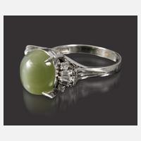 2. Hälfte 20. Jh., Platin gestempelt Pt900, Ringkopf besetzt mit einem grünen Chrysoberyllkatzenaugencabochon von 11 x 10 mm in Chatonfassung, flankiert von zusammen sechs Diamantbaguettes und vier Brillanten im Gesamtgewicht von 0,26 ct (Gewicht auf dem Inneren der Ringschiene vermerkt), minimale Tragespuren, RW ca. 18 mm, G ca. 7,8 g.