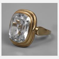 Mitte 20. Jh., Gelbgold gestempelt 333, ca. 18 mm hoher Ringkopf, besetzt mit einem aquamarinfarbenen synthetischen Spinell in Zargenfassung (Stein mit Tragespuren), RW 17 mm, G ca. 4,2 g.