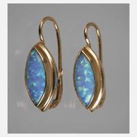 neuzeitlich, Gelbgold 585/1000 geprüft, jeweils besetzt mit einem spitzovalen Cabochon aus Edelopalimitat, in Zargenfassung, Maße Ohrring je 28 x 11 mm, G gesamt ca. 6 g.