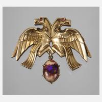 um 1930, Metall vergoldet, mittig abgehängter Opalcabochon, Augen mit kleinen facettierten Rubinen, leichte Tragespuren, Maße ca. 47 x 55 mm.