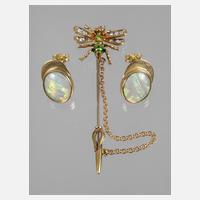 Ohrringe neuzeitlich, Gelbgold 585/1000 geprüft, jeweils besetzt mit einem Edelopalcabochon in Zargenfassung, Maße Ohrringe ca. 14 x 10 mm, Reversnadel um 1900, Gelbgold 585/1000 geprüft, Kopf gestaltet als Fliege mit grün emailliertem Körper, Flügel mit insgesamt sechs Kleinstdiamanten besetzt, L Nadel 51 mm, G gesamt ca. 5,5 g.