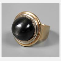 neuzeitlich, Weiß- und Gelbgold geprüft 585/1000, ca. 21 mm hoher Ringkopf, besetzt mit einem Katzenaugenstein mit schönem Lichtspiel, minimale Tragespuren, RW 17 mm, G ca. 13,7 g.