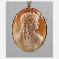 Ende 20. Jh., Gelbgold 585/1000 geprüft, besetzt mit einer Muschelkamee und hierauf fein geschnittenes Portrait der Göttin Diana, auch als Brosche zu tragen, rückseitig Gravur 1967–1992, Maße 51 x 35 mm, G ca. 12,1 g.