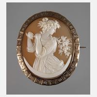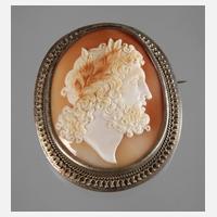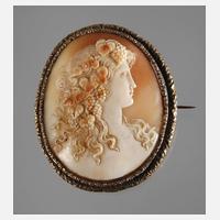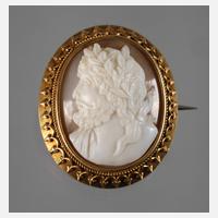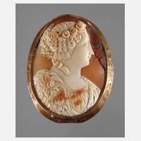 2. Hälfte 19. Jh., Gelbgold 585/1000 geprüft, besetzt mit einer ovalen Muschelkamee, hierauf Bildnis einer jungen Frau mit geschmücktem Haar, Nadelaufnahme fehlt, Tragespuren, Maße ca. 62 x 50 mm, G ca. 21,9 g.