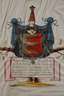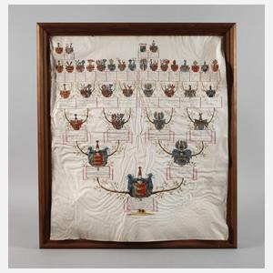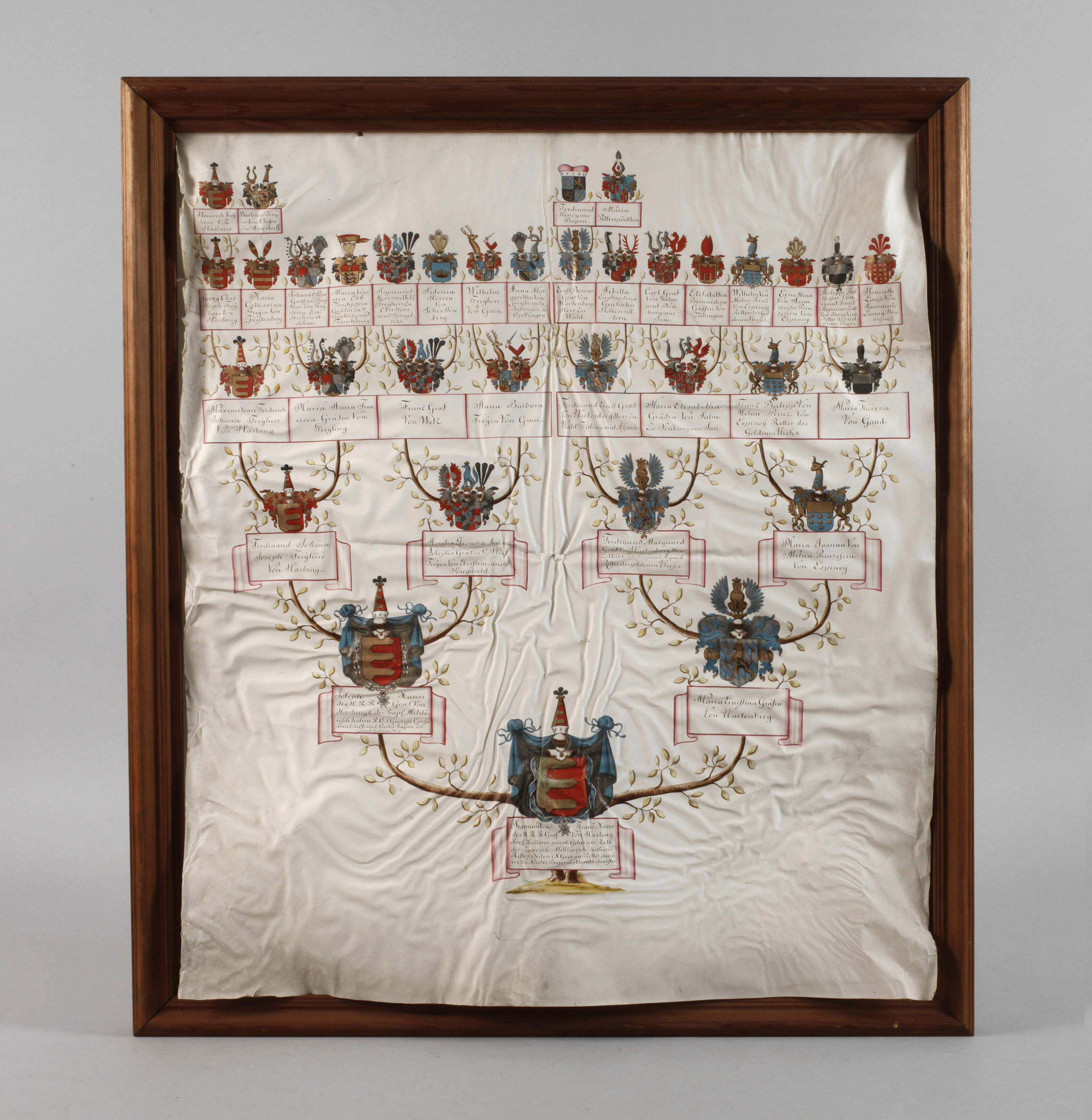 wohl 18. Jh., Stammbaum mit der bildlichen Darstellung der Vorfahren von Sigmund Franz Xaver von Haslang, der Stammbaum führt zurück bis zu Ferdinand Herzog von Bayern (1550-1608), Darstellung von insgesamt 35 Wappen, teils mit Gold gehöht, Gouache auf Pergament, Faltlinien und Knitterspuren, in Rahmen geheftet, Sichtmaß ca. 64 x 74,5 cm.