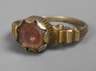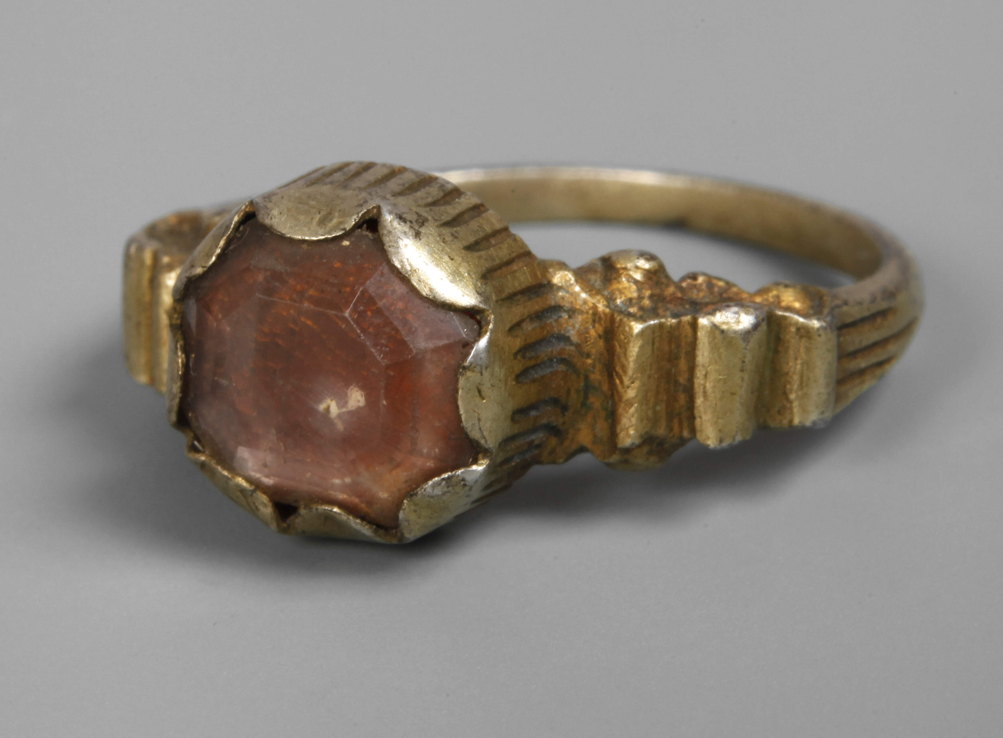 unbestimmtes Alters, sogenanntes Billon (Silberlegierung), ca. 10 mm hoher Ringkopf, besetzt mit einem facettierten Quarz, verzierte Ringschulter, stärkere Tragespuren, RW 19 mm, G ca. 4,2 g.