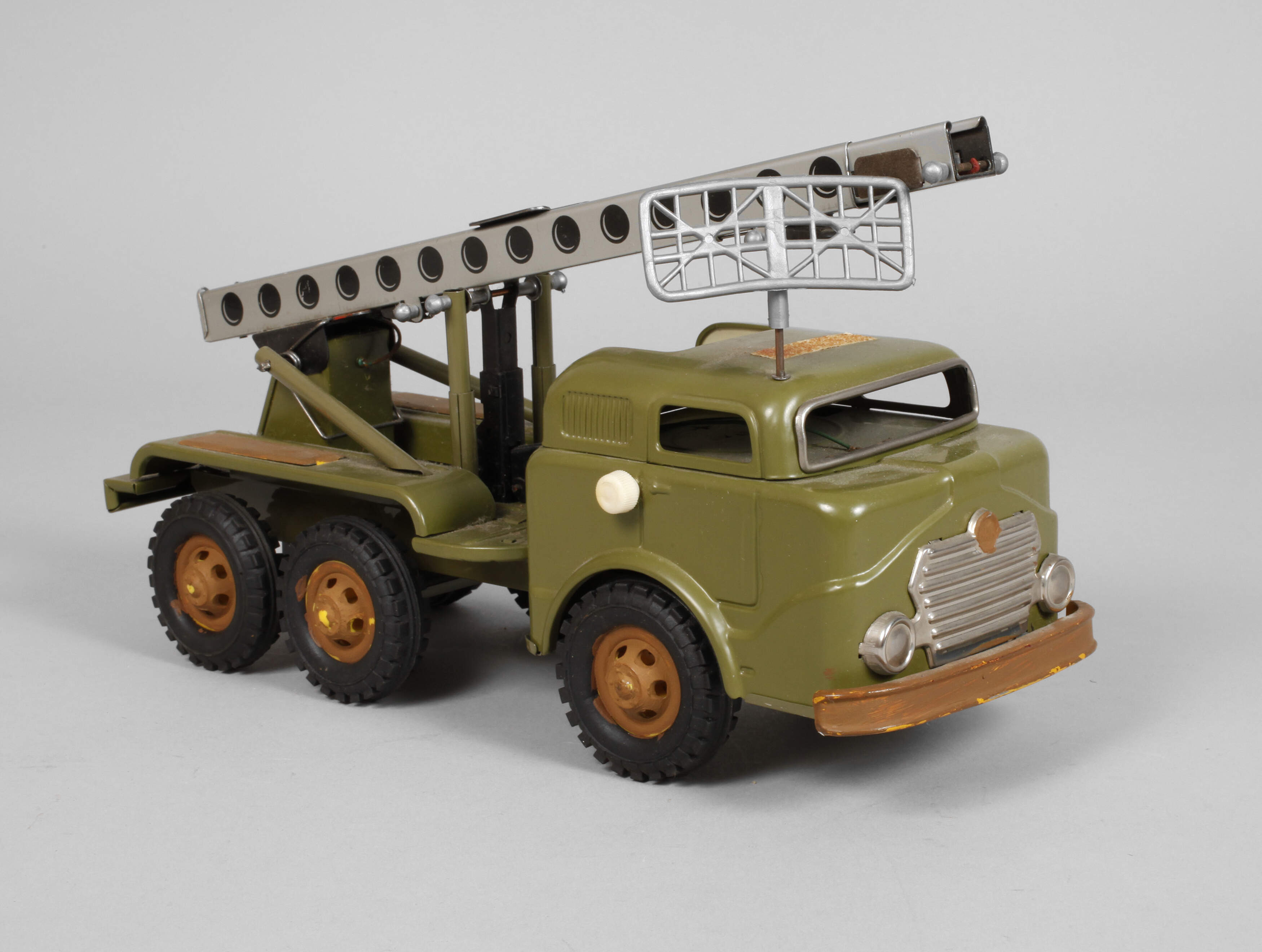 Modell 270, 1950er Jahre, gemarkt, Blech feldgrün lackiert und Kunststoffteile, dreiachsiger LKW mit intaktem Fiktionsantrieb, mittels Batterie beleuchtetem Radarbildschirm (Funktion nicht geprüft), Radarantenne, ausfahrbarer Abschussrampe und Gummibereifung, bespielter Zustand mit partiell übergangener Farbfassung, Rakete und Massesoldat fehlen, L 30 cm.