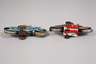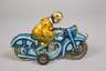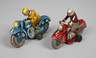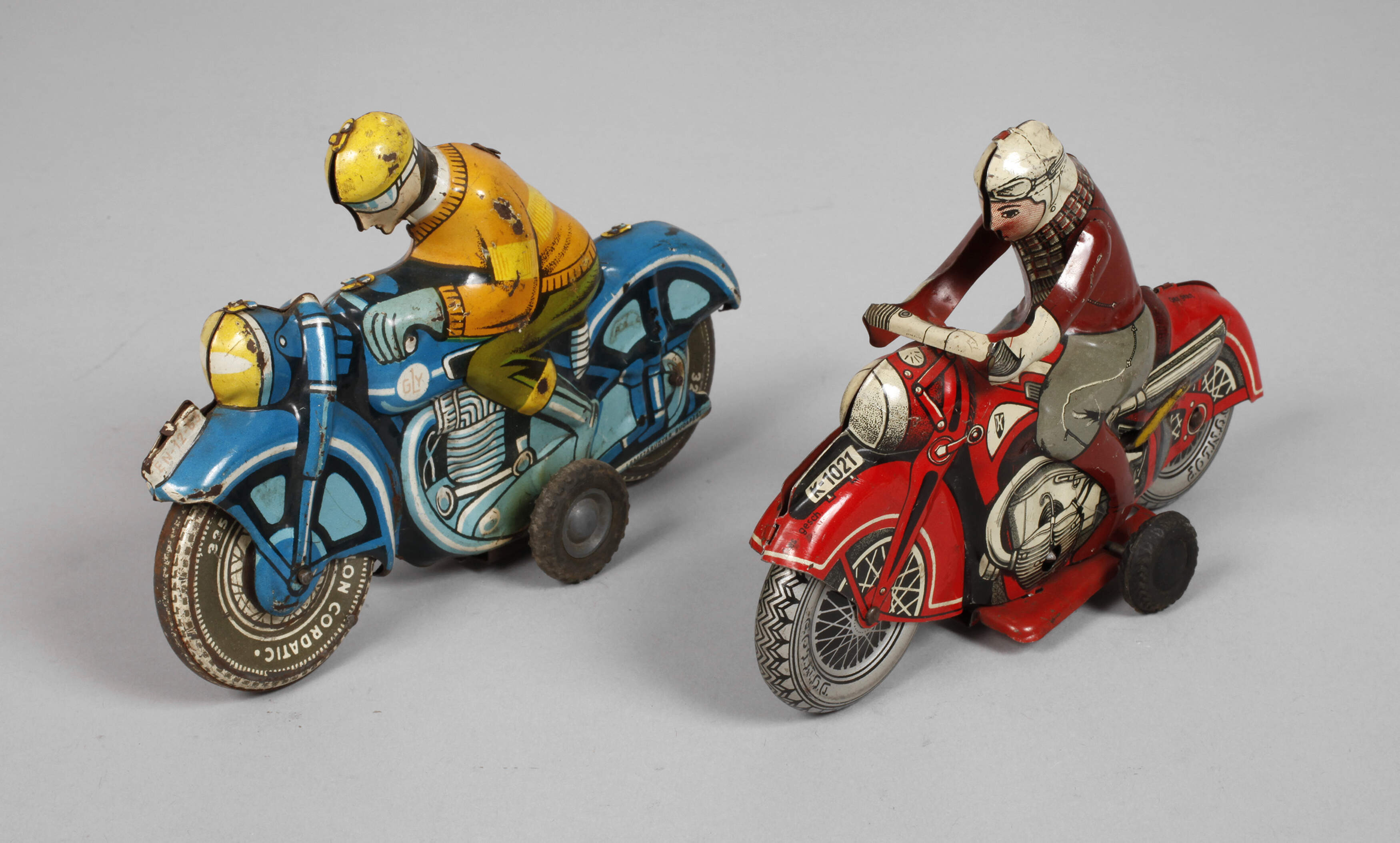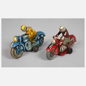um 1950/60, gemarkt und bezeichnet, Blech farbig lithographiert, jeweils mit plastischer Fahrerfigur und Gummistützrädern, das Huki Motorrad "K-1021" mit Zusatz Made in US-Zone Germany sowie Ges.gesch., intaktem Uhrwerkantrieb und Hebel für zwei Geschwindigkeitsstufen, dazu Gly Schwungrad-Motorrad "EN-12-63", Hersteller Lemezaru Gyar Budapest/Ungarn, bespielter Zustand mit minimalem Farbabrieb, L 15 und 16 cm.