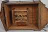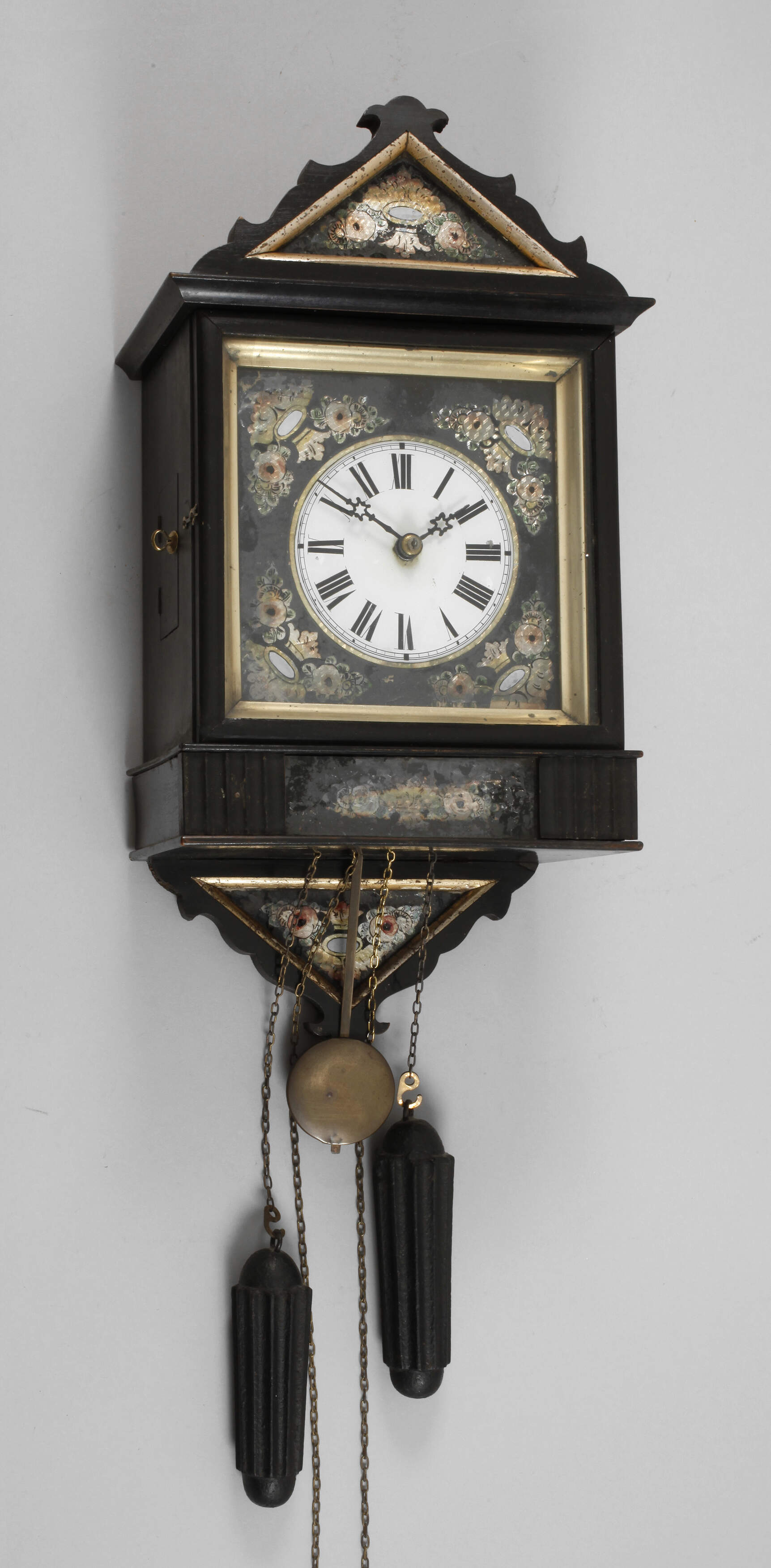 um 1870, Front verziert mit ornamentaler Hinterglasmalerei, Holzplatinenwerk mit Halbstundenschlag auf Tonfeder, zwei Gewichte, funktionstüchtig, Altersspuren, Maße 45 x 22 x 14 cm.