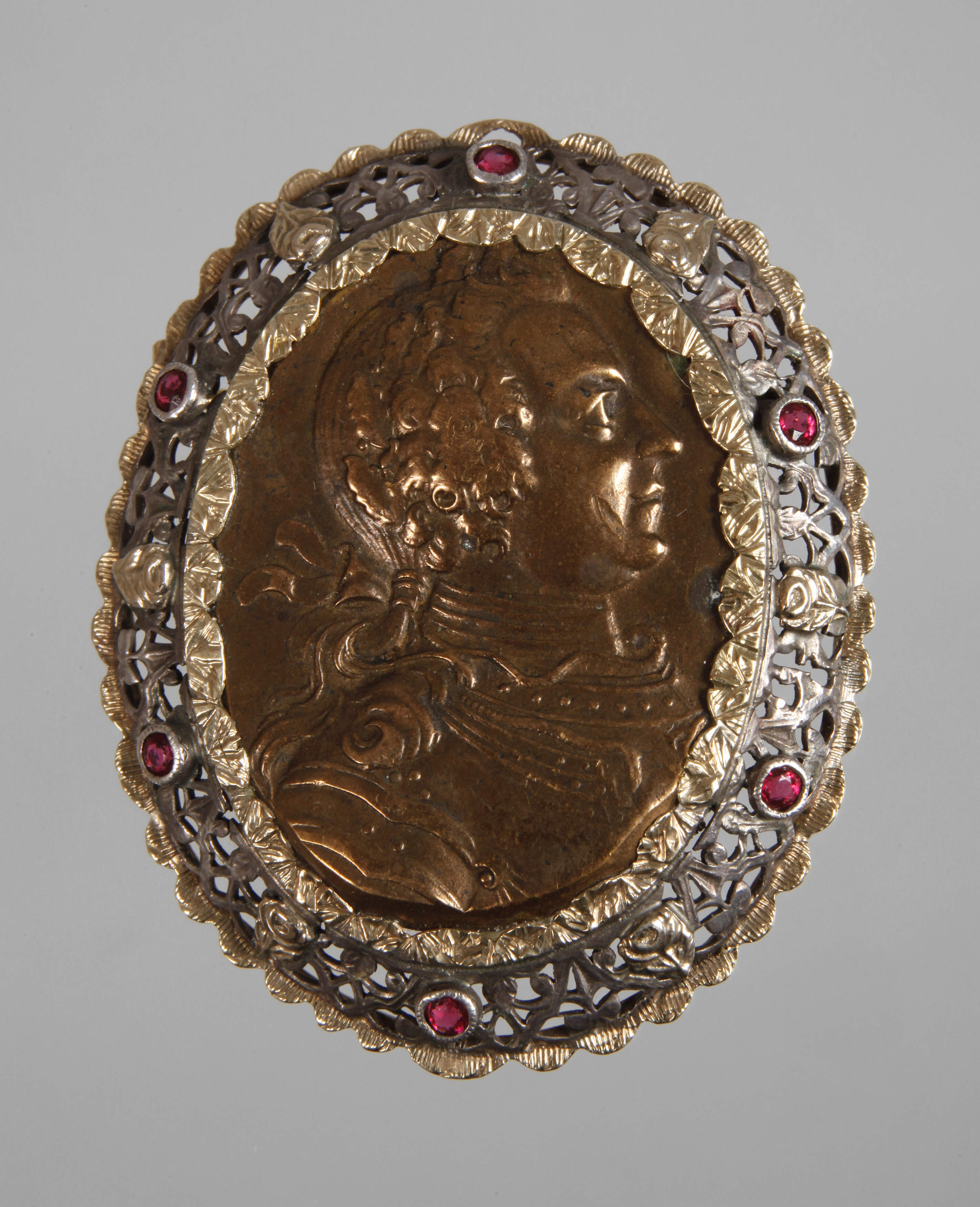 2. Hälfte 19. Jh., Silber geprüft und Gelbgold 750/1000 geprüft, mittig besetzt mit einer ovalen Bronzeplatte, hierauf Seitenportrait eines Herren, rückseitig allegorische Darstellung, umgeben von aufwendig durchbrochen gearbeitetem Band, besetzt mit sechs facettierten Rubinen und verziert mit Goldelementen, Maße der Brosche ca. 43 x 37 mm, G ca. 20,7 g.