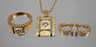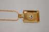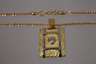 um 2000, Gelbgold gestempelt 18Kt bzw. 750, bestehend aus Damenring mit sich auf 10 mm verbreiternder Ringschiene, besetzt mit einem Brillant von ca. 0,1 ct in Zargenfassung, RW 18 mm, einem dazu passenden Anhänger von 28 x 17 mm an ca. 44 cm langer Kette sowie zwei ähnlichen Ohrringen, besetzt mit einem Diamant in Princess-cut von ca. 0,1 ct, sowie drei weiteren Brillanten, G gesamt ca. 23,8 g.