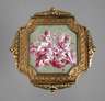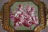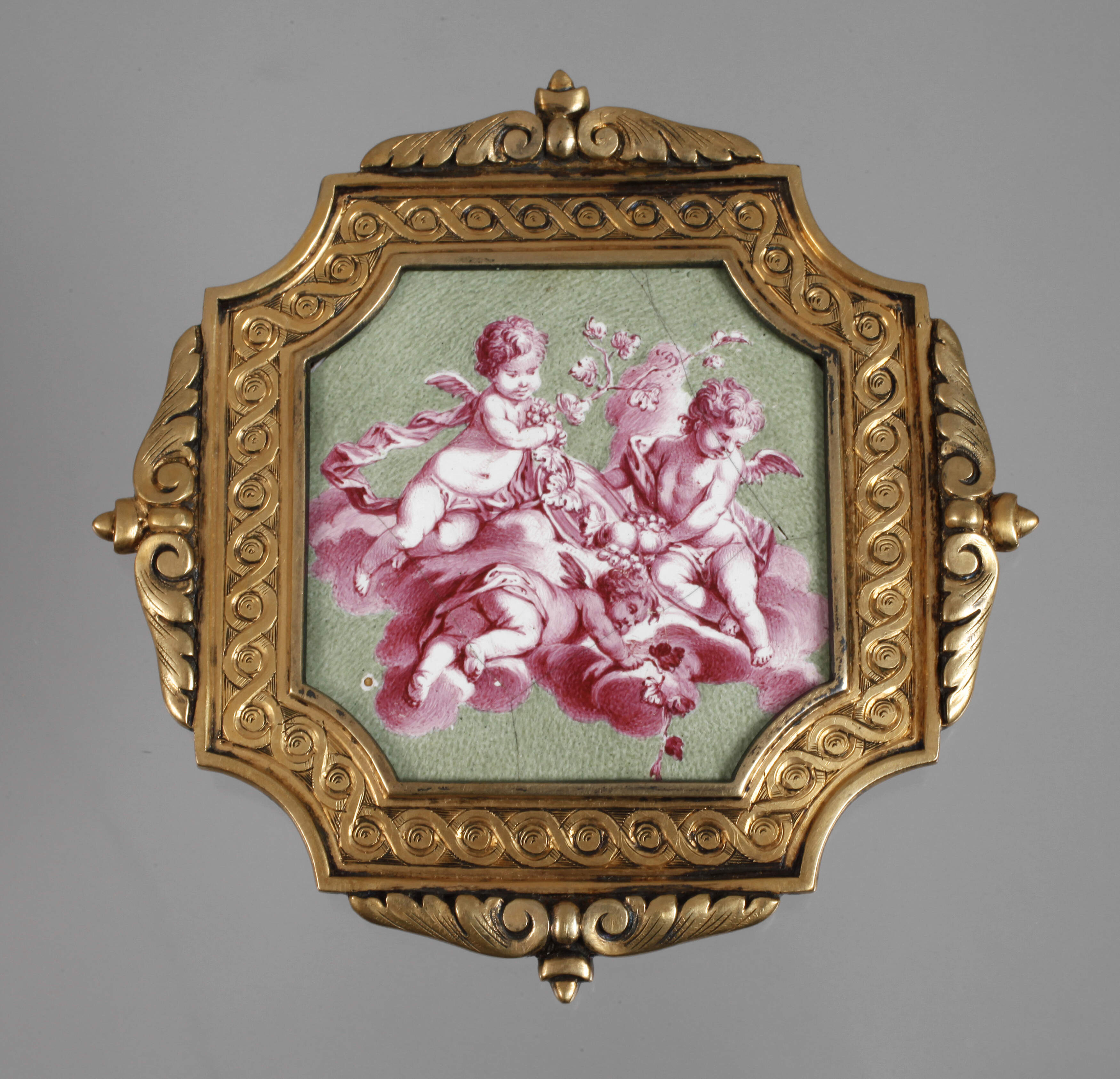 Ende 19. Jh., ungemarkt, mit spitzem Pinsel festgehaltene Szene dreier Jahreszeitenputti mit Weinrebe, vor monochromem Fond, in passig geschweiftem, von Spiralmotiv gesäumtem Bronzerahmen gefasst, dieser rückseitig mit Aufhängung, Craquelure, Altersspuren, Maße 9 x 9 cm.