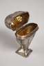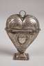 18. Jh., Silber im Fuß undeutlich gepunzt, geprüft, innen vergoldet, gravierte Besitzermonogramme AD und JM, reich floral graviert mit Rocaillenmotiven, herzförmig mit scharniertem Klappdeckel und am Deckel angebrachter Aufhängeöse, quadratischer Standfuß, Deckel minimal gedellt, sonst gute altersgemäße Erhaltung, H ca. 7,7 cm, G ca. 45 g.
