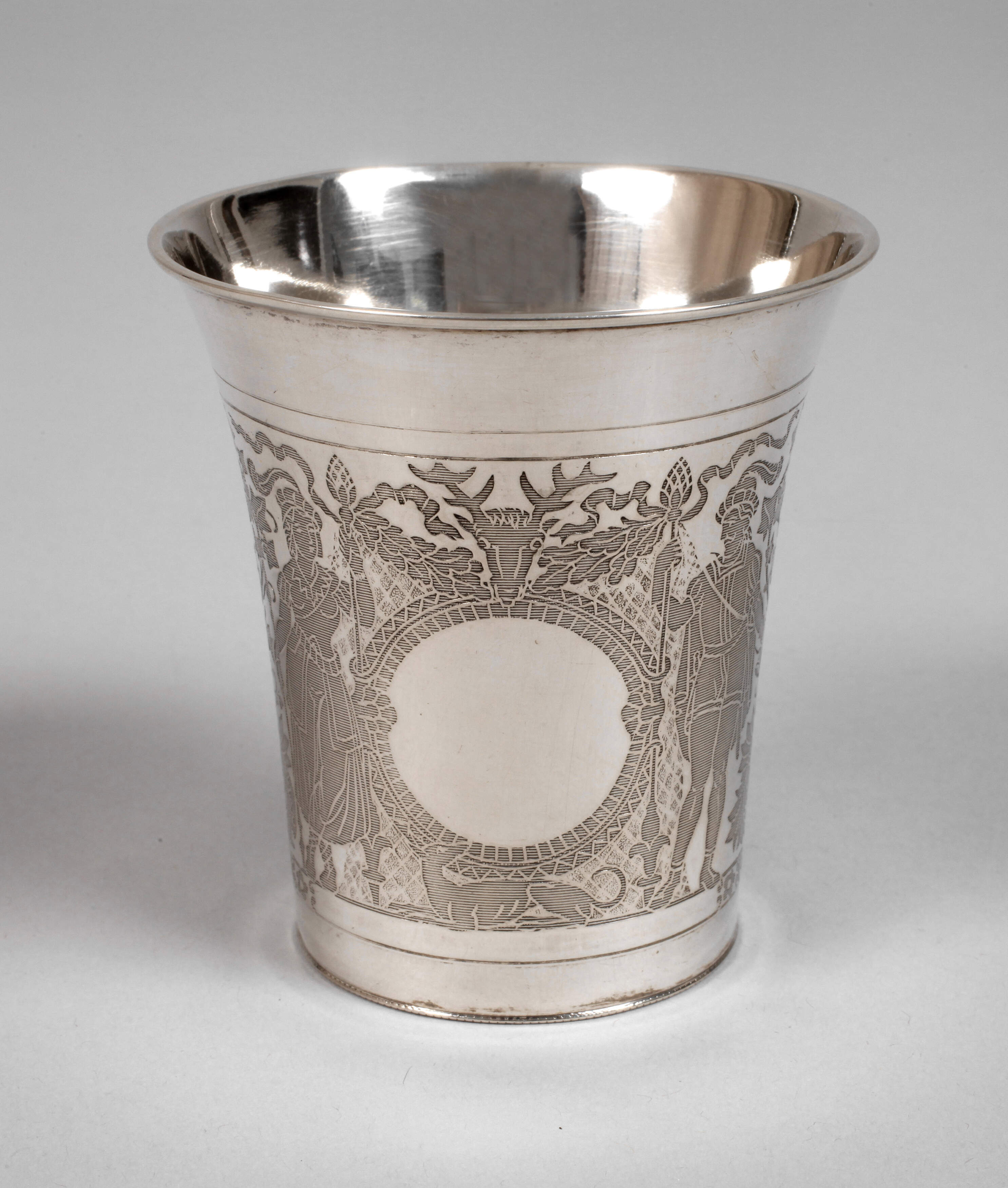 um 1860, Silber gestempelt 13 Lot, Wardeinzeichen Erfurt, konischer Becher mit ausschwingender Mündung, die Wandung umlaufend reich geätzt mit jagdlichen Motiven und reichem Blattwerk, Personenstaffage mit Jäger und Jägerin, dazwischen offene runde Kartusche, gute Erhaltung, H ca. 7,5 cm, G ca. 53 g.