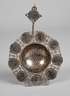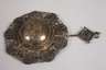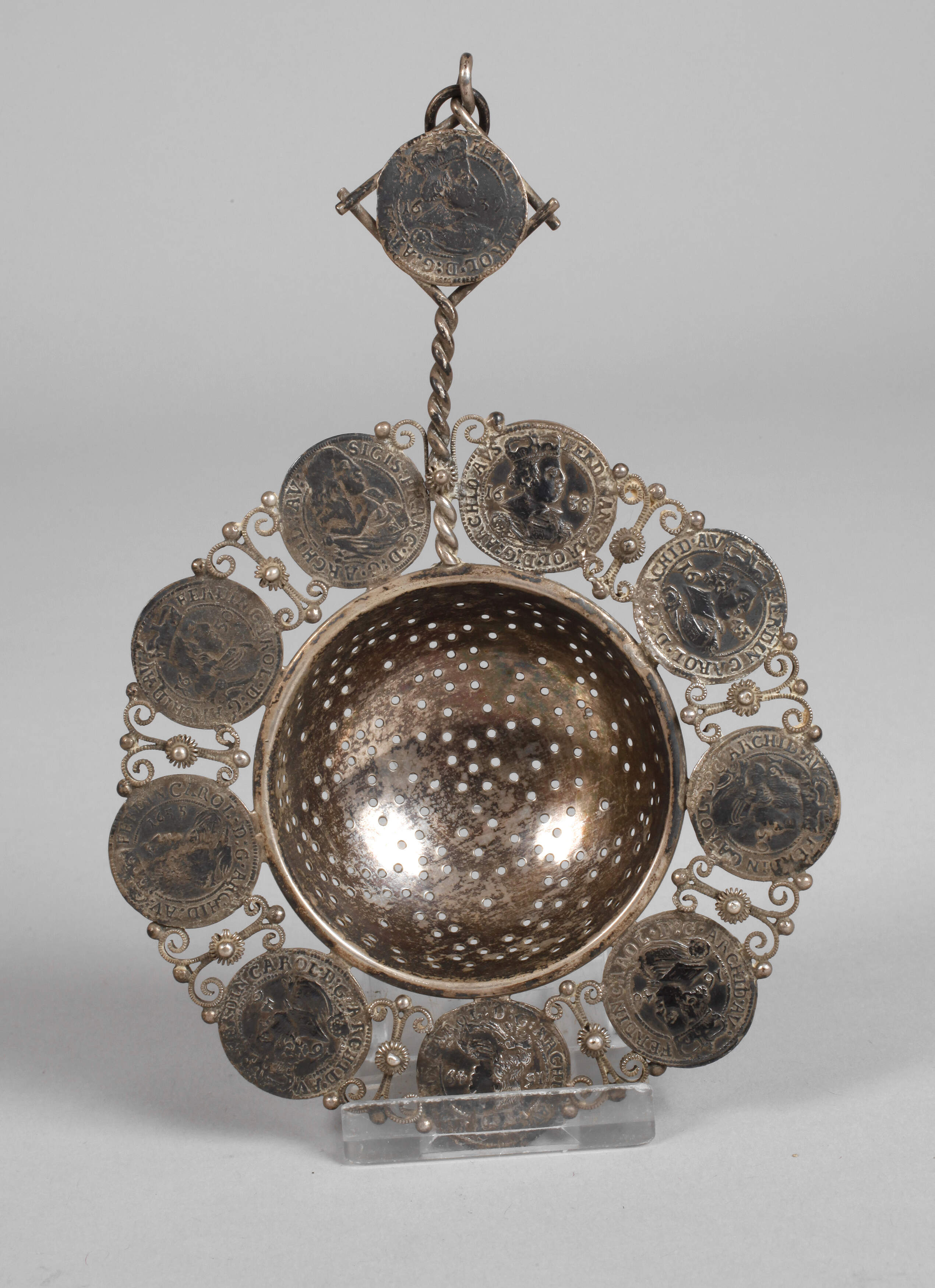 2. Hälfte 17. Jh., Teesieb aus Silber, umrandet mit zehn 3 Kreuzermünzen aus dem Hause Habsburg, darunter Ferdinand Karl I. 1637, 1638, 1640, 1643, 1646, 1649, 1650, 1655 sowie Sigismund Franz 1663, mit verziertem Silberdraht gefasst, guter altersgemäßer Zustand, D ca. 9,5 cm, G total ca. 44 g.