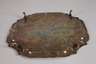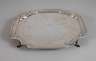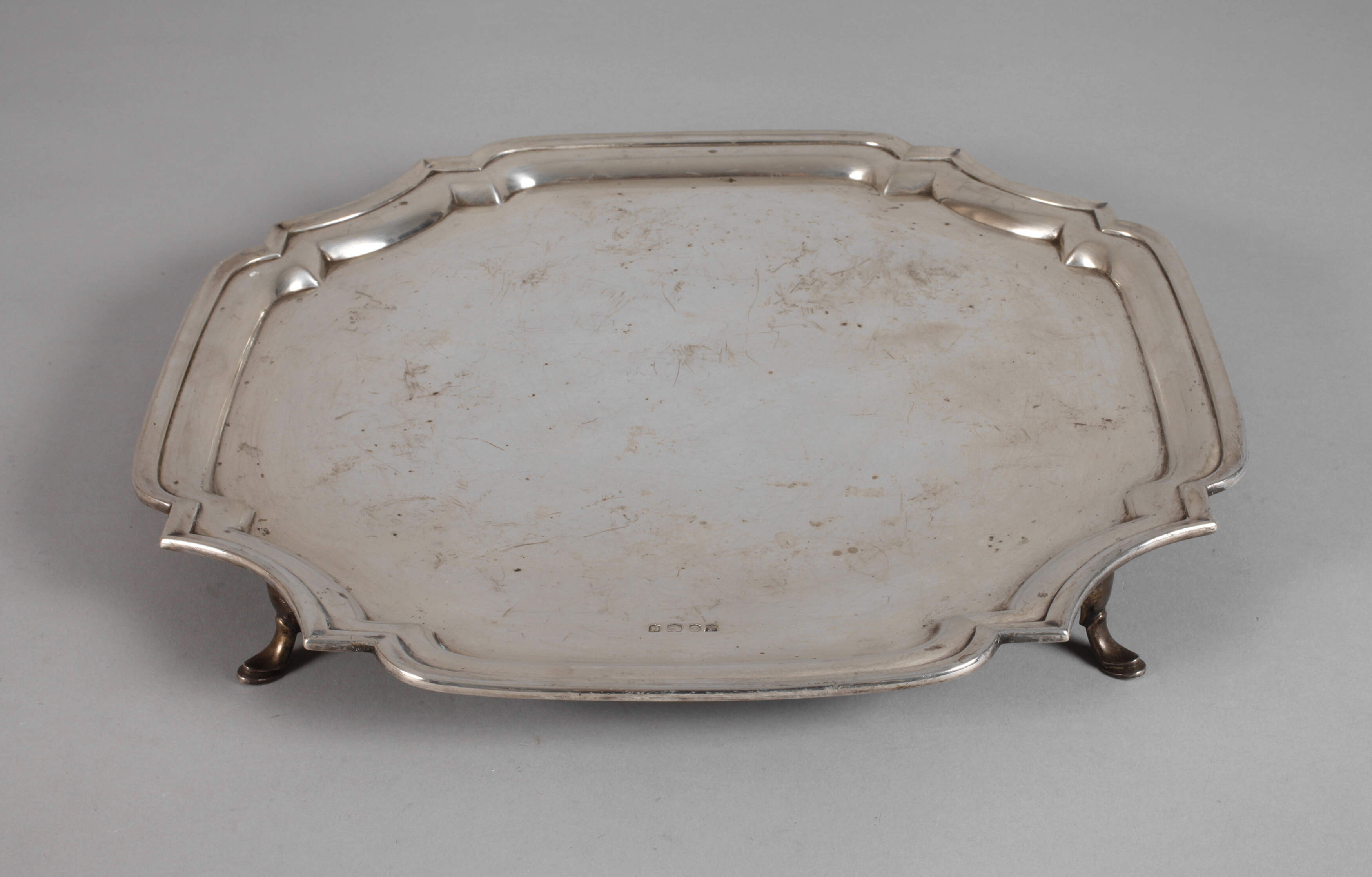 Silber gestempelt Lion Passant, Beschauzeichen der Stadt Sheffield, Jahresbuchstabe U für 1962, Herstellermarke Poston Products Ltd., geschweifte Form mit geraden Kanten, auf vier kleinen stilisierten Füßchen stehend, Alters- und Gebrauchsspuren, D ca. 34,5 cm, G ca. 1150 g.