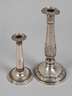 1. Hälfte 19. Jh., einer gemarkt Friedrich Jakob Hermann Spieker, Stadtmarke Kassel, der andere gestempelt 12 Lot und Buchstabe "A", klassizistische Verzierungen mit Akanthuslaub und Rippenbändern, einer beschwert, normale Gebrauchs- und Altersspuren, H max. ca. 26,5 cm, Silbergewicht ohne den beschwerten Leuchter ca. 370 g.