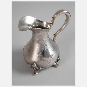 um 1870, gestempelt Friedeberg Berlin 750, bauchiges, auf vier Füßen stehendes Kännchen mit fein graviertem Wellendekor und offenen Monogrammkartuschen, hochgezogener geschwungener Henkel mit Isolierscheiben aus Horn, Alters- und Gebrauchsspuren, H ca. 13,7 cm, G ca. 216 g.