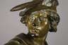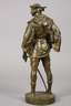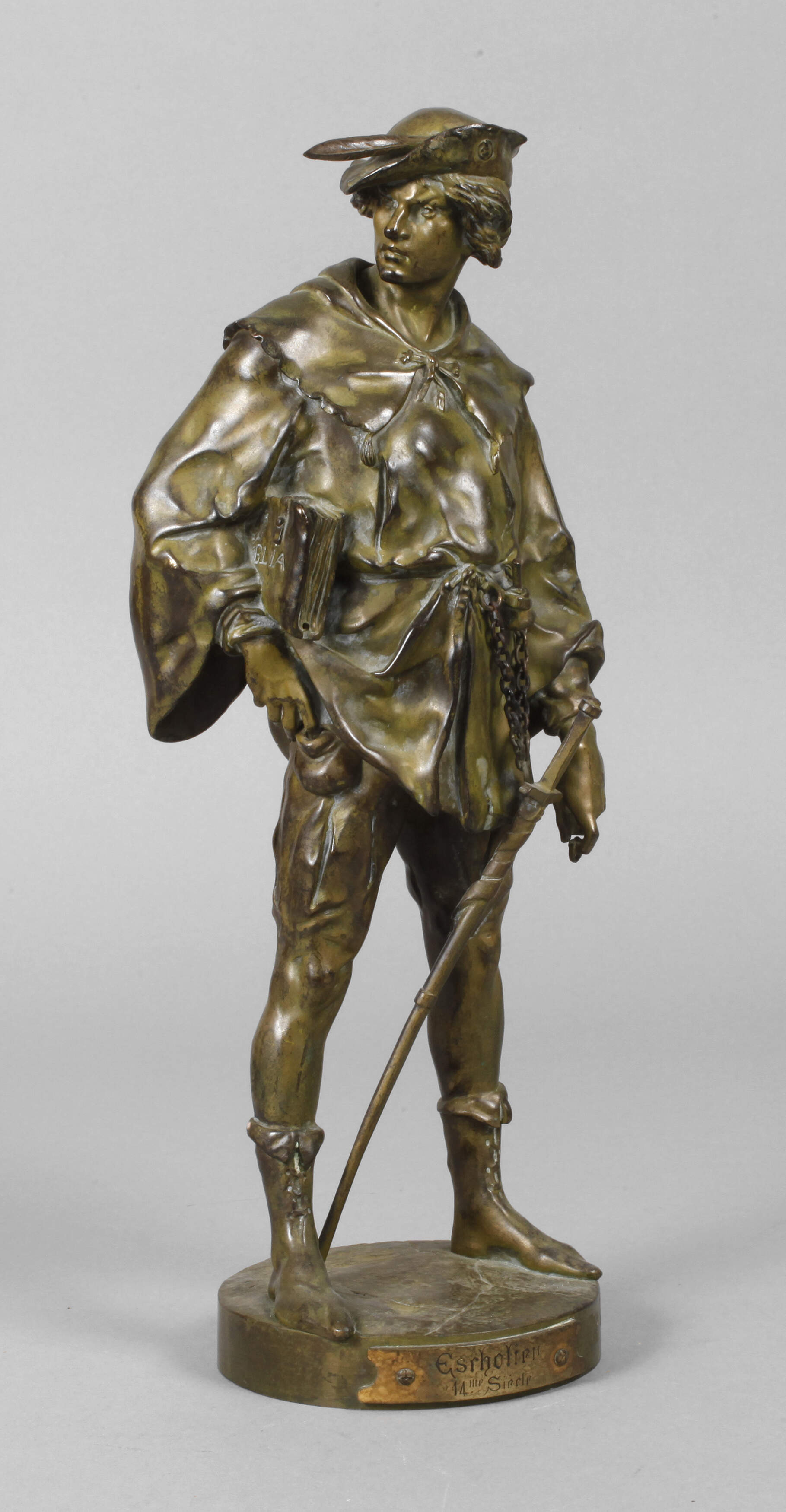 um 1900, auf der Plinthe signiert "E. Picault", recto mit Schild "Escholier 14 mc Siècle", Bronze nuanciert grün patiniert, Darstellung eines mittelalterlichen Studenten mit Schwert und Bibel, auf runder Plinthe, Verschraubung des Schwertes locker, sonst gute altersgemäße Erhaltung, H ca. 36,5 cm. Künstlerinfo: französischer Bildhauer und Medailleur (1839 Paris bis 1915 ebenda), Schüler von Royer, tätig in Paris. Quelle: Internet.