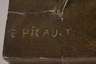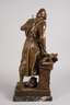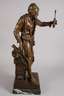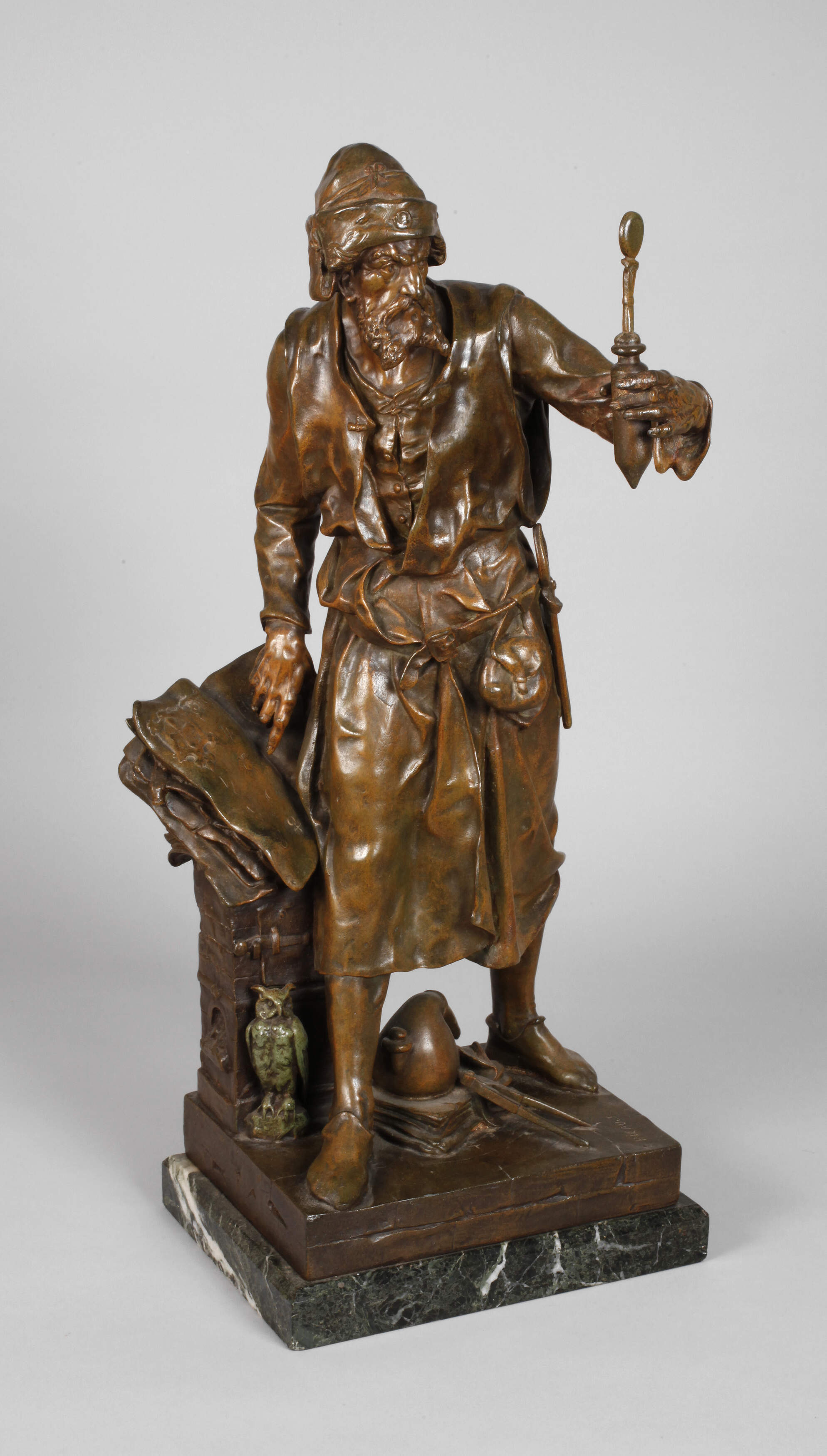 wohl um 1900, auf der Plinthe signiert E. Picault, verso Schriftzug "fabrication française Made in France", Metallguss polychrom in Kaltbemalung gefasst, Darstellung Alchemist mit Phiole, auf einem Postament gelagertes Buch, Plinthe mit verschiedenen Utensilien und Eule, auf Marmorsockel montiert, am Arm restauriert, Marmorsockel, H Skulptur ca. 64 cm, H gesamt ca. 68 cm. Künstlerinfo: französischer Bildhauer und Medailleur (1839 Paris bis 1915 ebenda), Schüler des Malers Henri Royer, stellte 1863-1914 in den Salons des Beaux Arts aus und war zu seiner Zeit sehr erfolgreich. Quelle: Internet/Thieme-Becker.