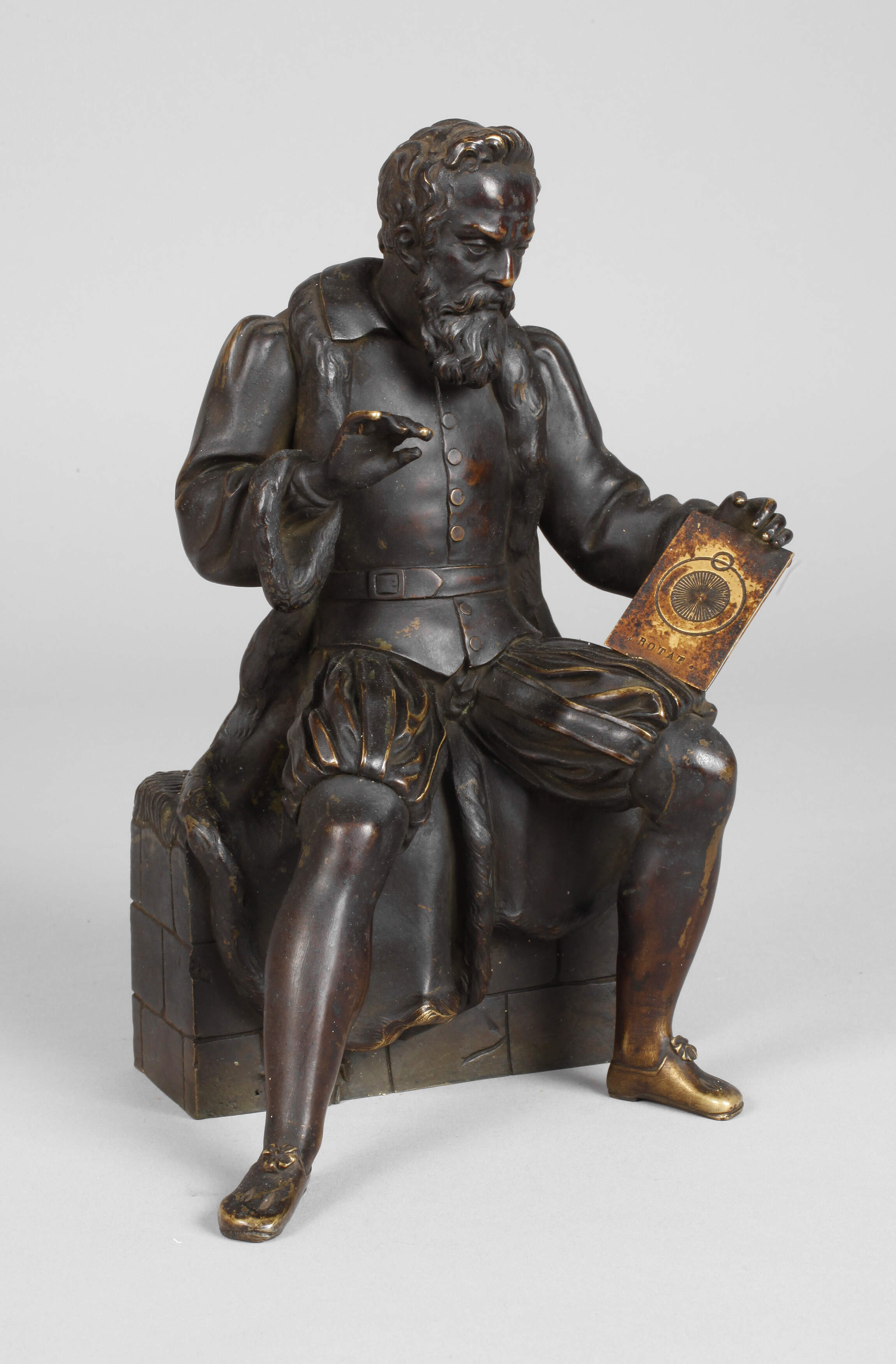 2. Hälfte 19. Jh, unsigniert, Bronze dunkel patiniert, Darstellung des auf einem als Mauer gestaltetem Sockel sitzenden Johannes Kepler, über seinem erneuerten, an das heliozentrische System angepasste Modell der Sphärenharmonie sinnierend, partiell etwas berieben und kleine Altersspuren, H ca. 20,5 cm.