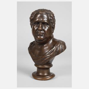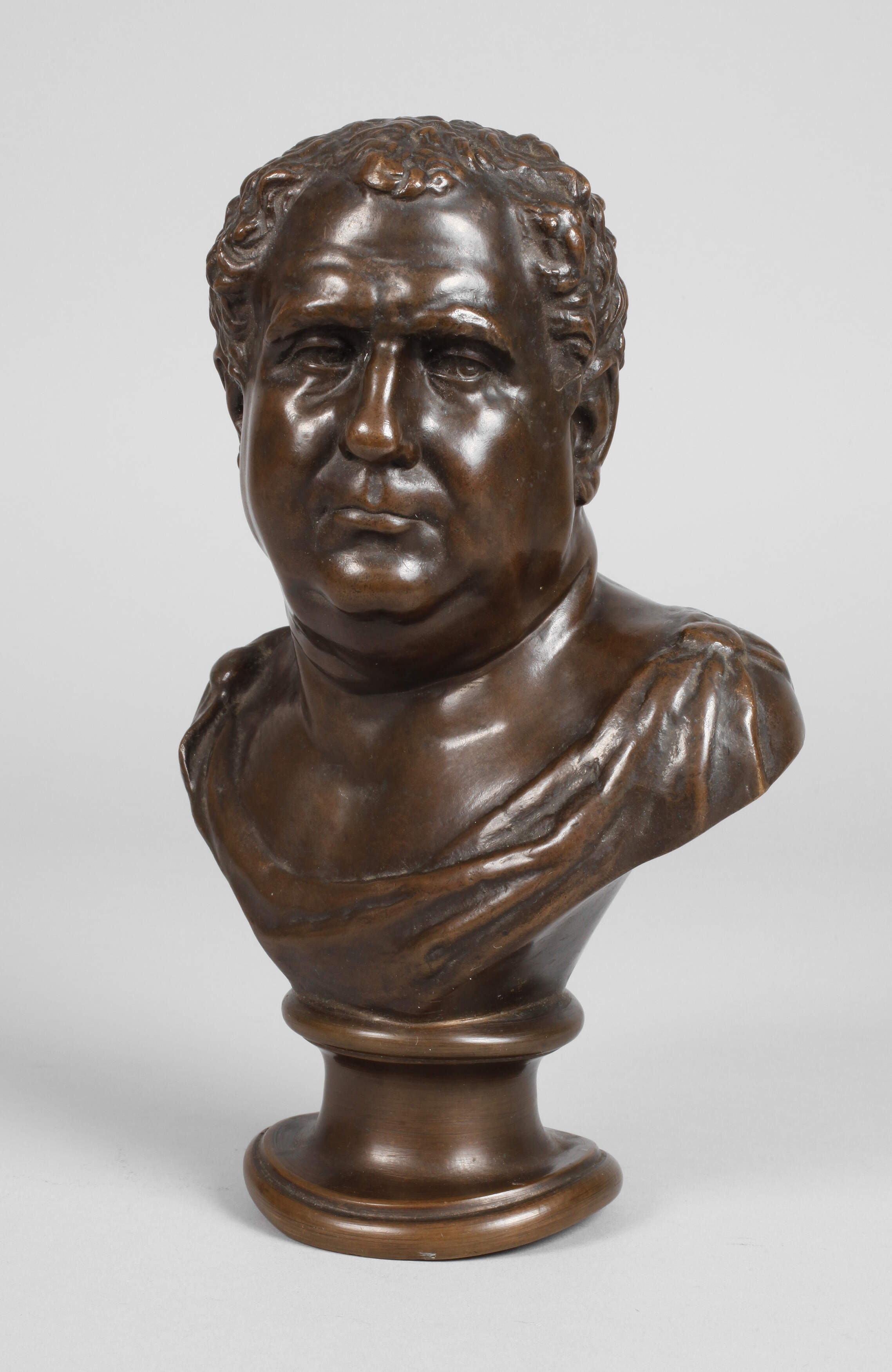 Mitte 19. Jh., Gießerstempel Reduction Mécanique A. Collas Brevete (Info: Achille Collas entwickelte ein Kopierverfahren für Gravuren und kleine Bronzen und betrieb das kommerzielle Kopieren bekannter Skulpturen seit 1938 zusammen mit Ferdinand Barbedienne), Bronze braun patiniert, Darstellung des sogenannten Pseudo-Vitellius oder Vitellus-Grimani (aus der Grimani-Sammlung in Venedig), es handelt hierbei um eine Rezeption eines wohl italienischen Kunstwerks der 1. Hälfte des 16. Jahrhunderts, die lange Zeit für eine Darstellung des Kaisers Aulus Vitellius aus der Hadrianszeit gehalten wurde, die Datierung wurde jedoch später ins 16. Jahrhundert verlegt und auch die Zuschreibung des Dargestellten ist unter Experten umstritten, das 1523 von Kardinal Domenico Grimani der Republik Venedig vermachte Stück befindet sich heute im Louvre. Quelle: Arachne Datenbank sowie collections.louvre.fr, Inventarnummer MR 684.
