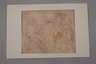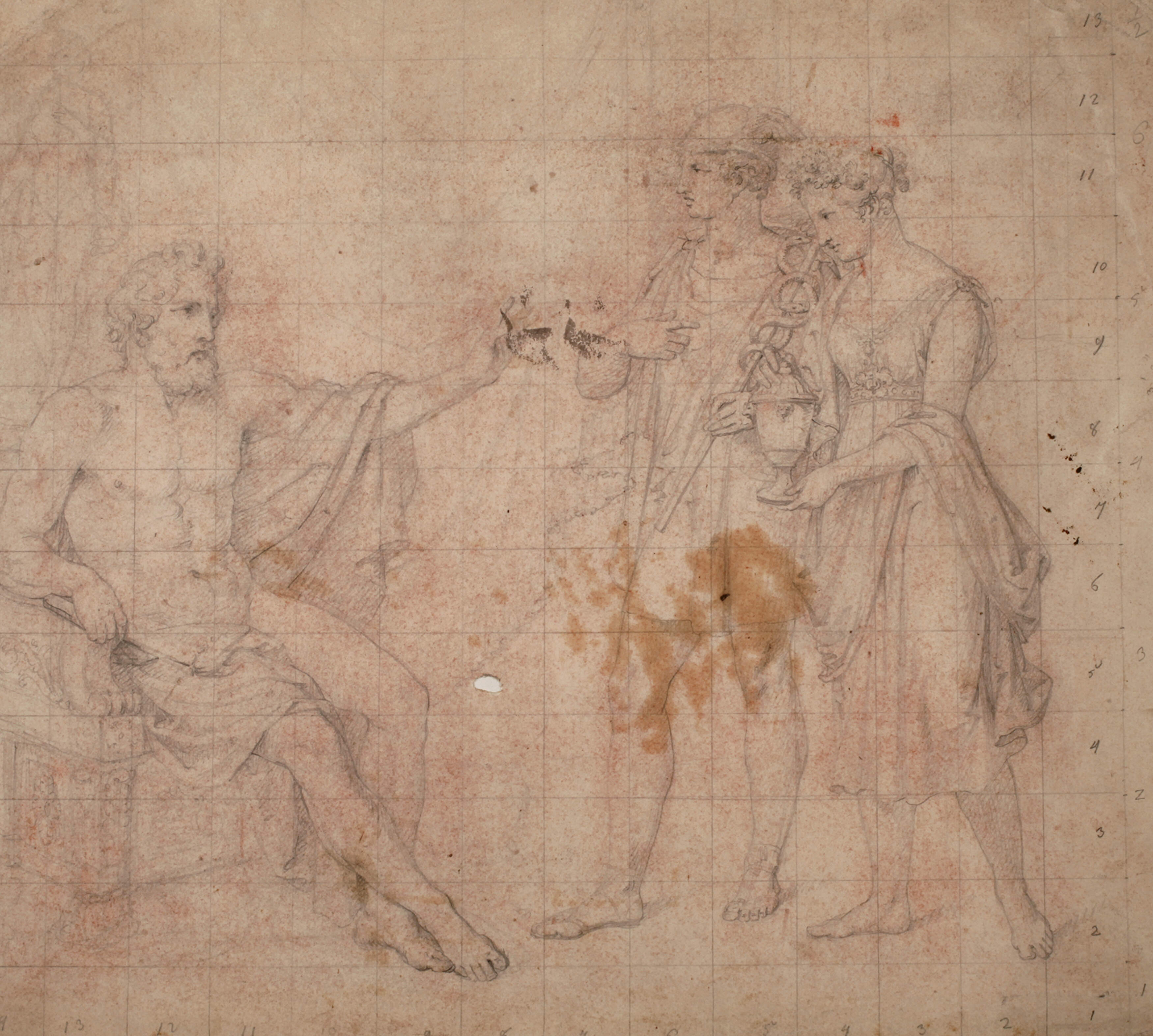 Hermes mit Caduceus bringt Pandora zu Prometheus, welcher vor einer schwer erkennbaren Skulptur thront und Pandora mit einer Handbewegung abweist, Graphitzeichnung auf rötlich getöntem Papier mit aufgezeichneter Quadrierung, um 1800, fleckig und Loch im Papier, unter Passepartout montiert, Blattmaße ca. 32 x 36,5 cm.