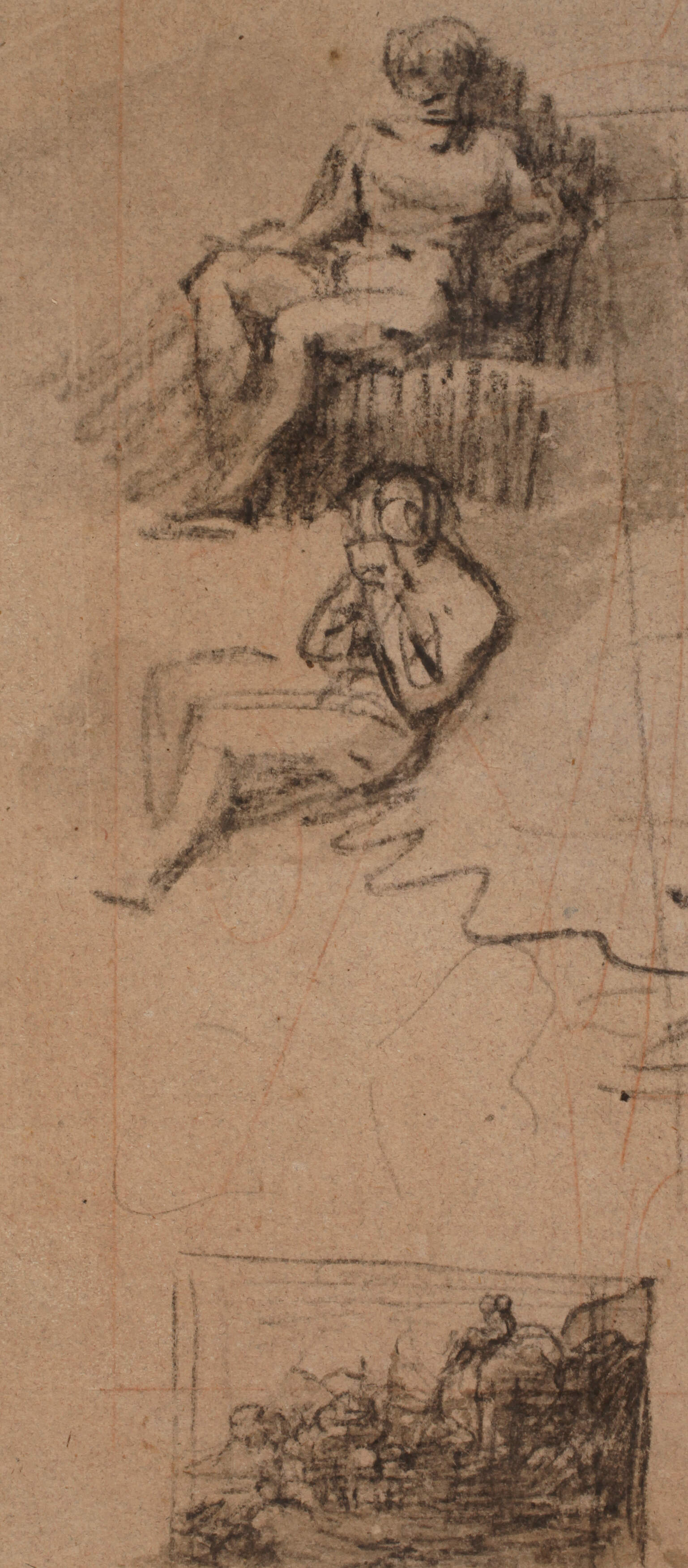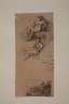 Skizzenblatt mit zwei sitzenden Figuren und einer Landschaftsdarstellung, rückseitig Portraitstudien, Kohle, partiell mit Tusche laviert, 19. Jh., auf Rückseite bezeichnet "Jakob Gauermann", Papier gebräunt und kleiner Einschnitt, unter Passepartout montiert und hierauf bezeichnet "Jakob Gauermann Oeffingen 1773-1843 Miesenbach Kreideskizze: Aktstudien", Blattmaße ca. 21,5 x 10 cm. Künstlerinfo: auch Jacob, dt. Maler, Zeichner und Graphiker (1773 Oeffingen bis 1843 Miesenbach), Steinbildhauerlehre in Hohenheim bei Stuttgart, 1788-81 Studium an der Stuttgarter Akademie in den Fächern Kupferstich und Zeichnen, bis 1798 Verlagsgehilfe bei einem Heilbronner Kunsthändler, ging 1798 nach Wien, 1802 zusammen mit Martin von Molitor Reise nach Tirol, 1803 zweite Alpenreise, 1811 beauftragte Erzherzog Johann den Künstler die schönsten Ansichten der Steiermark zu zeichnen, 1818 Ernennung zum Kammermaler und Mitglied der Wiener Akademie, Quelle: Thieme-Becker und Wikipedia.