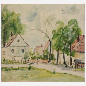 von Bäumen gesäumte Straße mit einigen Häusern und Passanten unter luftig bewölktem Himmel, Aquarell über Bleistift, links unten signiert und datiert "AHennig (19)60", auf Rahmenrückwand betitelt "Die Waldstraße" und weitere Notate, Aquarell mit Knickspur und etwas fleckig, hinter Glas gerahmt, Falzmaße ca. 25,5 x 27 cm. Künstlerinfo: dt. Maler, Fotograf und Graphiker (1907 Leipzig bis 1998 Zwickau), studierte 1932–33 mit Stipendium am Bauhaus Dessau/Berlin bei Joost Schmidt, Mies van der Rohe, Wassily Kandinsky, Paul Klee und Josef Albers, anschließend arbeitslos, 1935–45 als Bauarbeiter dienstverpflichtet, nach 1945 Gründungsmitglied der Gruppe „Bildender Künstler“ beim Kulturbund Zwickau, ab 1952 Mitglied des Verbandes Bildender Künstler (VBK) der DDR, wegen Auseinandersetzung mit dogmatischen Kulturfunktionären 1952–72 als Betonbauer tätig, in seiner Freizeit wächst ein bedeutendes Werk in der Tradition des Bauhauses, ab 1972 freischaffend und auch in der DDR zunehmende Anerkennung seines Schaffens, erhielt zahlreiche Auszeichnungen, unter anderem Max-Pechstein-Preis und Bundesverdienstkreuz, tätig in Zwickau, Quelle: Vollmer, Eisold “Maler in der DDR” und Internet.