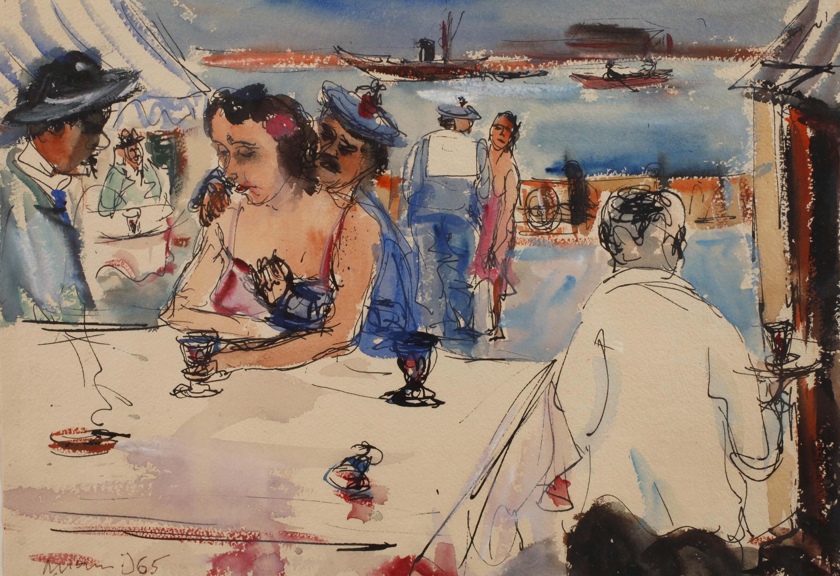 belebte Bar mit einigen Matrosen und Damen, im Hintergrund Blick auf ein Hafenbecken mit Schiffen, mit lockerer Tuschefeder angelegte und mit Aquarell sowie Deckweiß überarbeitete Mischtechnik, links unten signiert und datiert "AHennig (19)65", leicht gegilbt, auf Unterlagekarton und hinter Glas gerahmt, Blattmaße ca. 20,6 x 29,5 cm, beigegeben Buch "Albert Hennig Zeichnungen & Skizzen", erschienen bei Edition Artpress Berlin. Künstlerinfo: dt. Maler, Fotograf und Graphiker (1907 Leipzig bis 1998 Zwickau), studierte 1932-33 mit Stipendium am Bauhaus Dessau/Berlin bei Joost Schmidt, Mies van der Rohe, Wassily Kandinsky, Paul Klee und Josef Albers, anschließend arbeitslos, 1935-45 als Bauarbeiter dienstverpflichtet, nach 1945 Gründungsmitglied der Gruppe „Bildender Künstler“ beim Kulturbund Zwickau, ab 1952 Mitglied des Verbandes Bildender Künstler (VBK) der DDR, wegen Auseinandersetzung mit dogmatischen Kulturfunktionären 1952-72 als Betonbauer tätig, in seiner Freizeit wächst ein bedeutendes Werk in der Tradition des Bauhauses, ab 1972 freischaffend und auch in der DDR zunehmende Anerkennung seines Schaffens, erhielt zahlreiche Auszeichnungen, unter anderem Max-Pechstein-Preis und Bundesverdienstkreuz, tätig in Zwickau, Quelle: Vollmer, Eisold “Maler in der DDR” und Internet.
