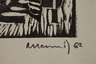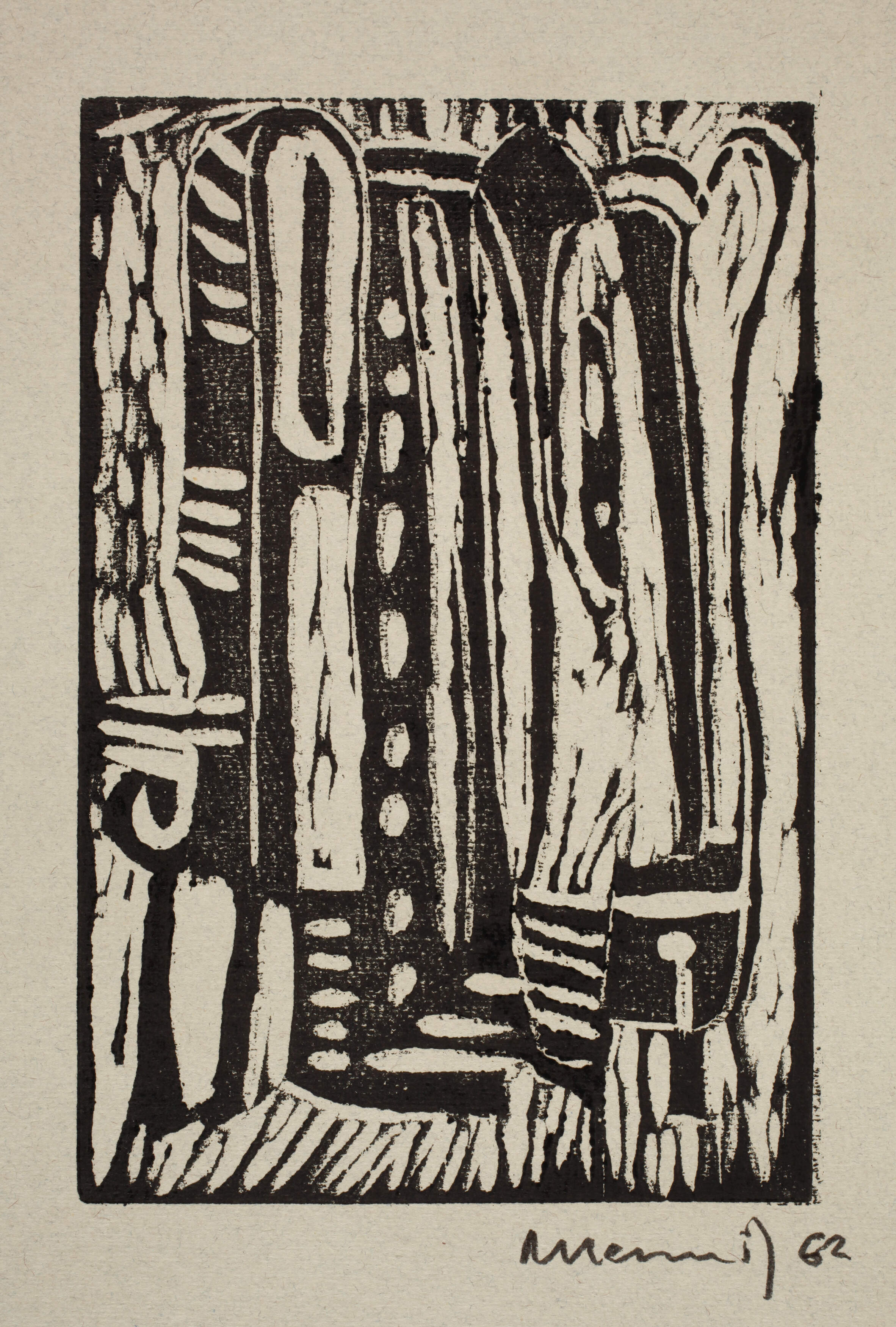 ungegenständliches Arrangement, Holzschnitt auf grünlichem Maschinenbütten, unter der Darstellung rechts in Filzstift signiert und datiert "AHennig (19)62", wohl späterer Abzug, Darstellungsmaße ca. 16 x 10,7 cm, Blattmaße ca. 29 x 21,3 cm. Künstlerinfo: dt. Maler, Fotograf und Graphiker (1907 Leipzig bis 1998 Zwickau), studierte 1932–33 mit Stipendium am Bauhaus Dessau/Berlin bei Joost Schmidt, Mies van der Rohe, Wassily Kandinsky, Paul Klee und Josef Albers, anschließend arbeitslos, 1935–45 als Bauarbeiter dienstverpflichtet, nach 1945 Gründungsmitglied der Gruppe „Bildender Künstler“ beim Kulturbund Zwickau, ab 1952 Mitglied des Verbandes Bildender Künstler (VBK) der DDR, wegen Auseinandersetzung mit dogmatischen Kulturfunktionären 1952–72 als Betonbauer tätig, in seiner Freizeit wächst ein bedeutendes Werk in der Tradition des Bauhauses, ab 1972 freischaffend und auch in der DDR zunehmende Anerkennung seines Schaffens, erhielt zahlreiche Auszeichnungen, unter anderem Max-Pechstein-Preis und Bundesverdienstkreuz, tätig in Zwickau, Quelle: Vollmer, Eisold “Maler in der DDR” und Internet.