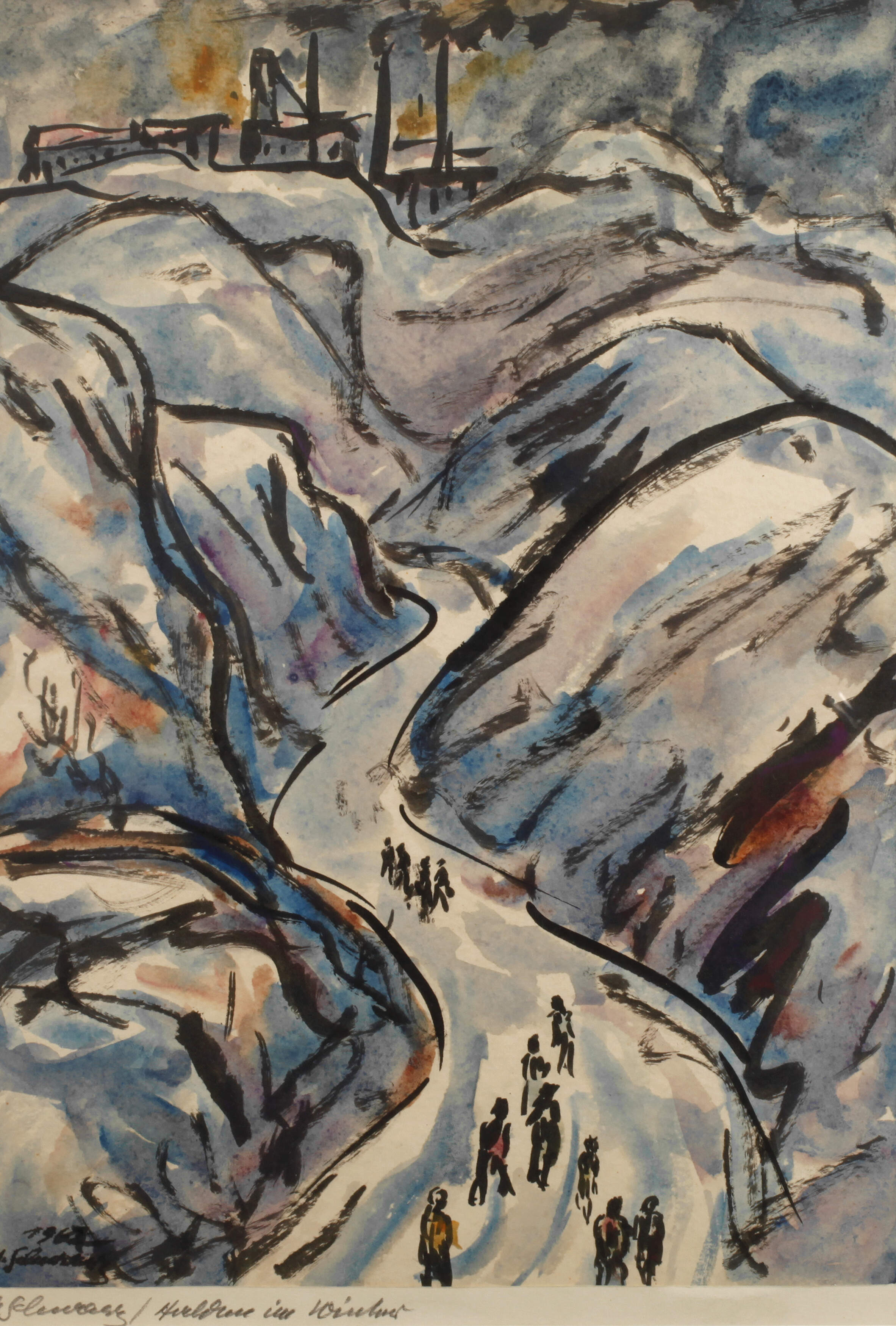 Straße mit Passanten durch tief verschneite Halden des Zwickauer Steinkohlenreviers mit Schachtanlagen am Horizont, Mischtechnik (Tusche über Aquarell) auf Papier, links unten datiert und signiert "1962 A. Schwarz", hinter schlichtem Passepartout, hier in Blei signiert und betitelt "A. Schwarz »Halden im Winter«", hinter Glas und doppeltem Passepartout gerahmt, Passepartoutausschnitt ca. 34,5 x 24 cm. Künstlerinfo: deutscher Maler, Graphiker und Plastiker (1895 Zwickau bis 1977 Zwickau), ab 1910 Lehre und Tätigkeit als Porzellanmaler sowie autodidaktische künstlerische Ausbildung, seit 1932 freischaffend, nach 1945 Lehrtätigkeit an der Mal- und Zeichenschule Zwickau, Mitglied des VBK-DDR, 1984 Retrospektive in Karl-Marx-Stadt. Quelle: Vollmer und Eisold „Künstler in der DDR".