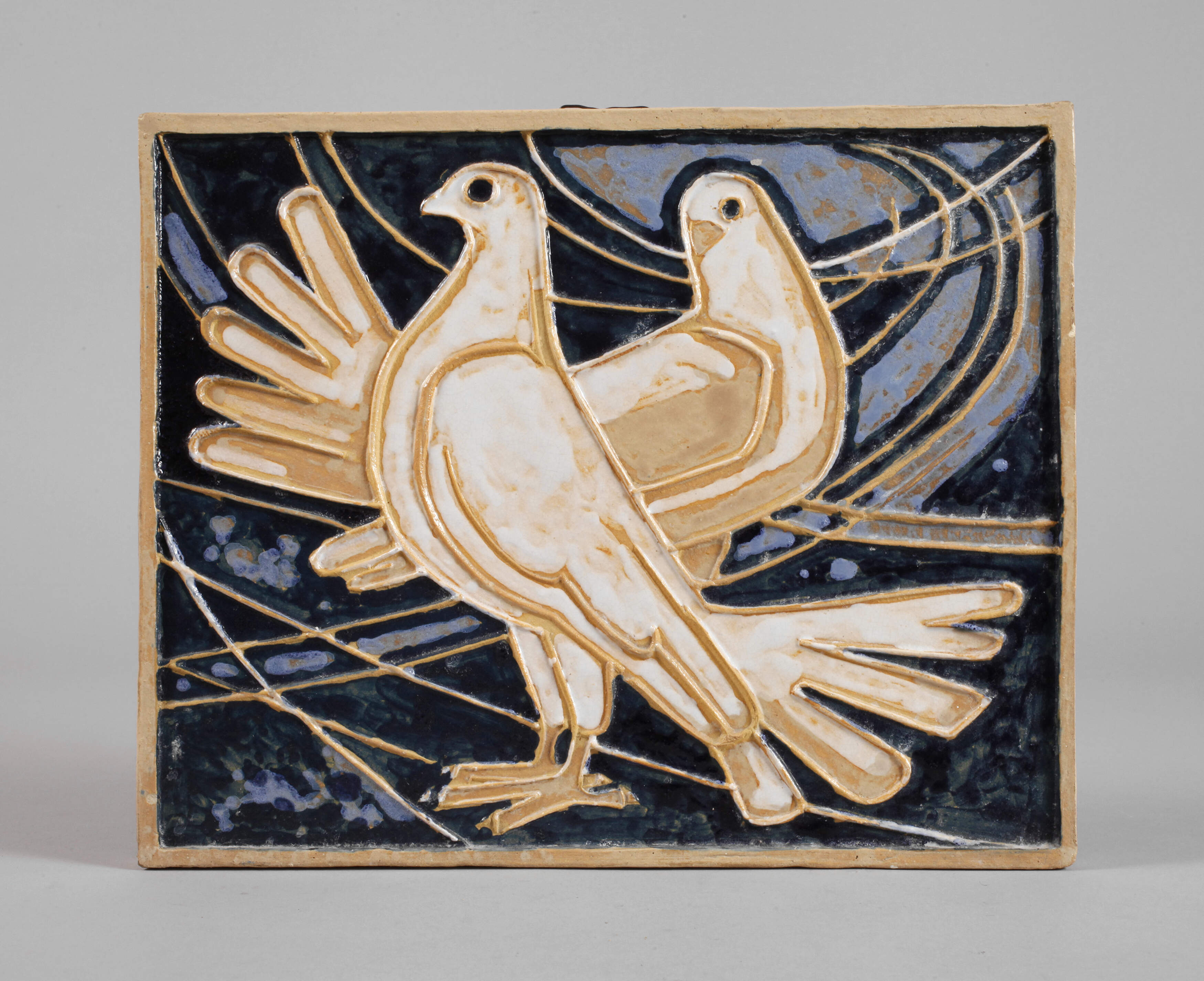 zwei weiße Friedenstauben vor dunkelblauem Grund, verschiedenfarbig glasierte Keramik, um 1960–70, rückseitig bezeichnet "»Friedenstauben« von Alfred Tröger *11.11.1898 Werdau +2.10.1974 G. Reimer 17. Mai 2001", oben mittig Löcher und Draht für Wandaufhängung, Maße ca. 22,7 x 27,8 x 2 cm. Künstlerinfo: dt. Graphiker, Landschafts- und Stilllebenmaler (1898 Langenhessen bis 1974 Werdau), zunächst Malerlehre, künstlerisch weitestgehend Autodidakt, Kriegsdienst im 1. Weltkrieg, nach 1918 tätig als Dekorationsmaler, beschickte ab 1927 Ausstellungen in Zwickau, Berlin und Dresden, ab 1936 freischaffend in Werdau, 1938 Reise nach Italien, 1943–46 Kriegsdienst im 2. Weltkrieg und Kriegsgefangenschaft in Oldenburg in Schleswig-Holstein, mit Wolfgang Berndt, Heinz Fleischer, Karl-Heinz Schuster, Albert Schwarz, Erich Schulz und Karl Michel Mitglied der "Gruppe 1950", ab 1951 Dozent an der Mal- und Zeichenschule Zwickau, parallel Betriebsvertrag mit dem Güterkraftverkehr "Schwarze Pumpe" Hoyerswerda, unternahm weitere Studienreisen an die Nord- und Ostsee, nach Franken, Ostpreußen, Thüringen, Böhmen, dem Erzgebirge und der Lausitz, Mitglied des Görlitzer Landesbundes für bildende Künste und der Leipziger Kunstgenossenschaft, Ehrung mit dem Preis der Hermann-Illgen-Stiftung, tätig in Werdau/Sachsen, Quelle: Vollmer, Saur "Bio-Bibliographisches Künstlerlexikon", Eisold "Künstler in der DDR", "Blankenheimer Museumsblätter Nr. 15" und Frank Weiß „Malerei im Vogtland“.