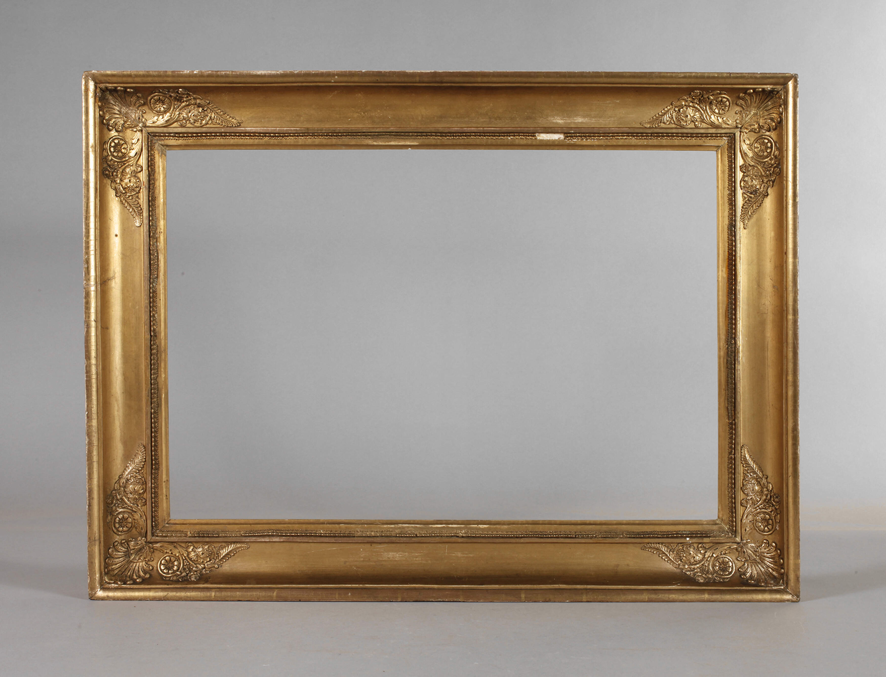 um 1860, ca. 9 cm breiter, weit gekehlter Rahmen, innen umlaufend mit Kymation verziert, in den Ecken Empireornamentik aus Voluten, Palmetten und Floralismen, blattvergoldet, die Ecken auf Gehrung gesägt, Farbfassung partiell übergangen, kleinere Fehlstellen, Falzmaße 61 x 41 cm.
