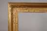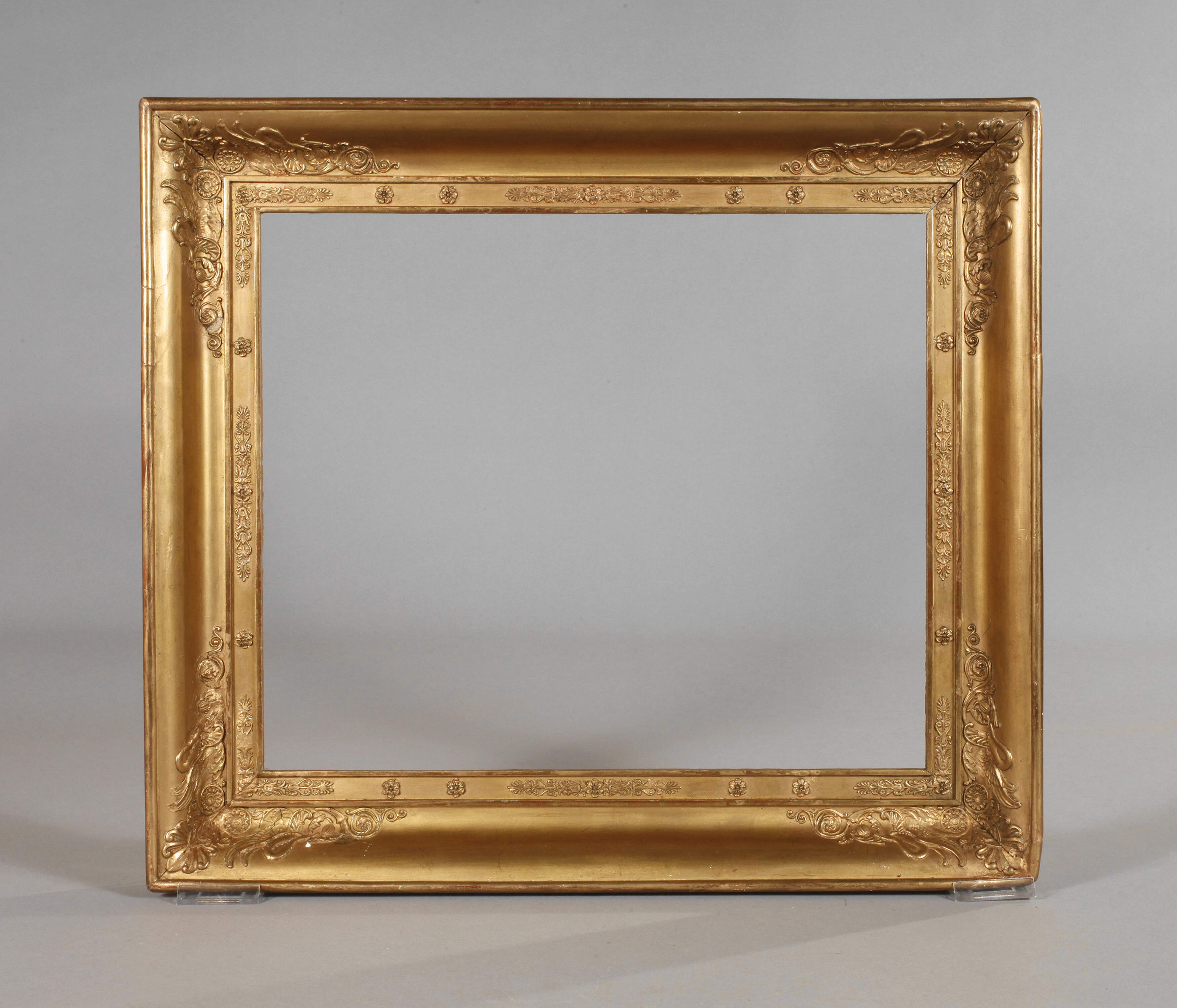 wohl um 1830, ca. 8 cm breiter, aufsteigend profilierter und gestuckter Rahmen, Goldbronze und Vergoldung auf rotem Bolus, Eckornamente aus Schwänen, Blattwerk und Rosetten, Gehrung Gesägt und vergratet, Stuck rissig, Fehlstellen, Farbfassung partiell übergangen, Falzmaße ca. 53 x 43,5 cm.