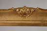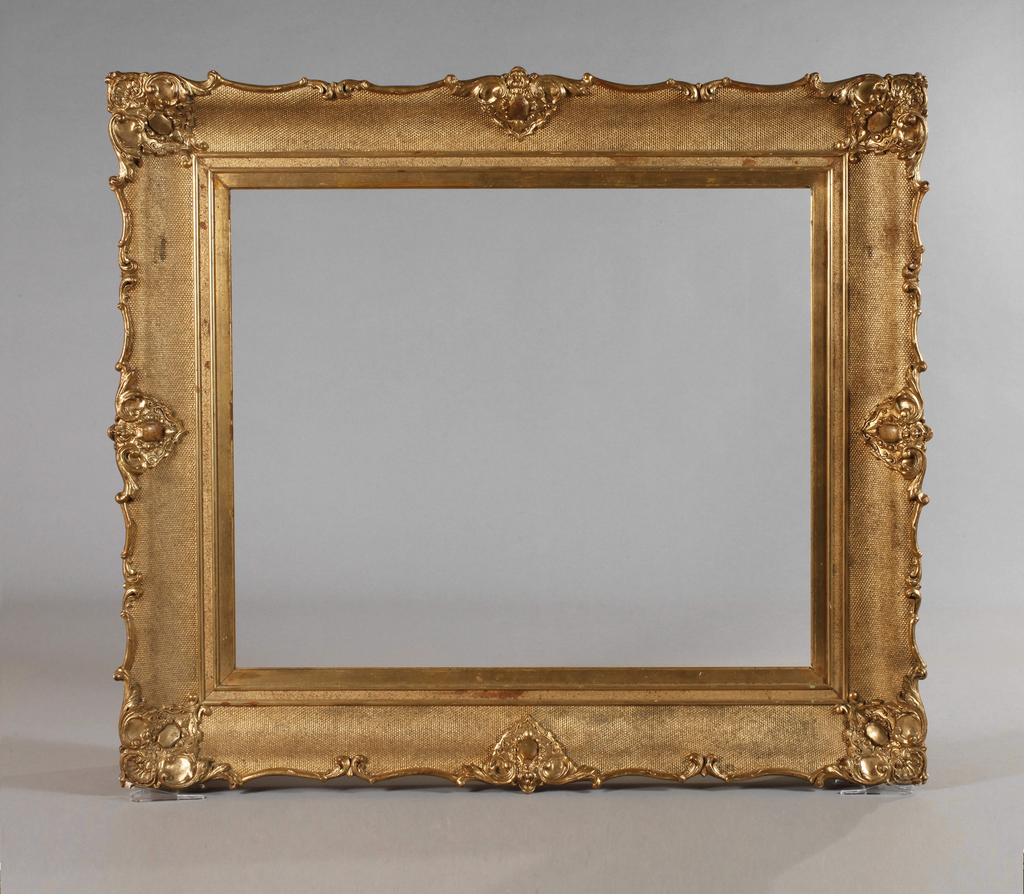 Mitte 19. Jh., circa 15 cm breiter, aufsteigend profilierter goldgefasster Stuckrahmen mit Eck- und Mittelkartuschen, Kehle verziert mit Gitterdekor, Ecken auf Gehrung gesägt, geringe Erhaltungsmängel, Altersspuren, Falzmaße ca. 57,5 x 69,5 cm.
