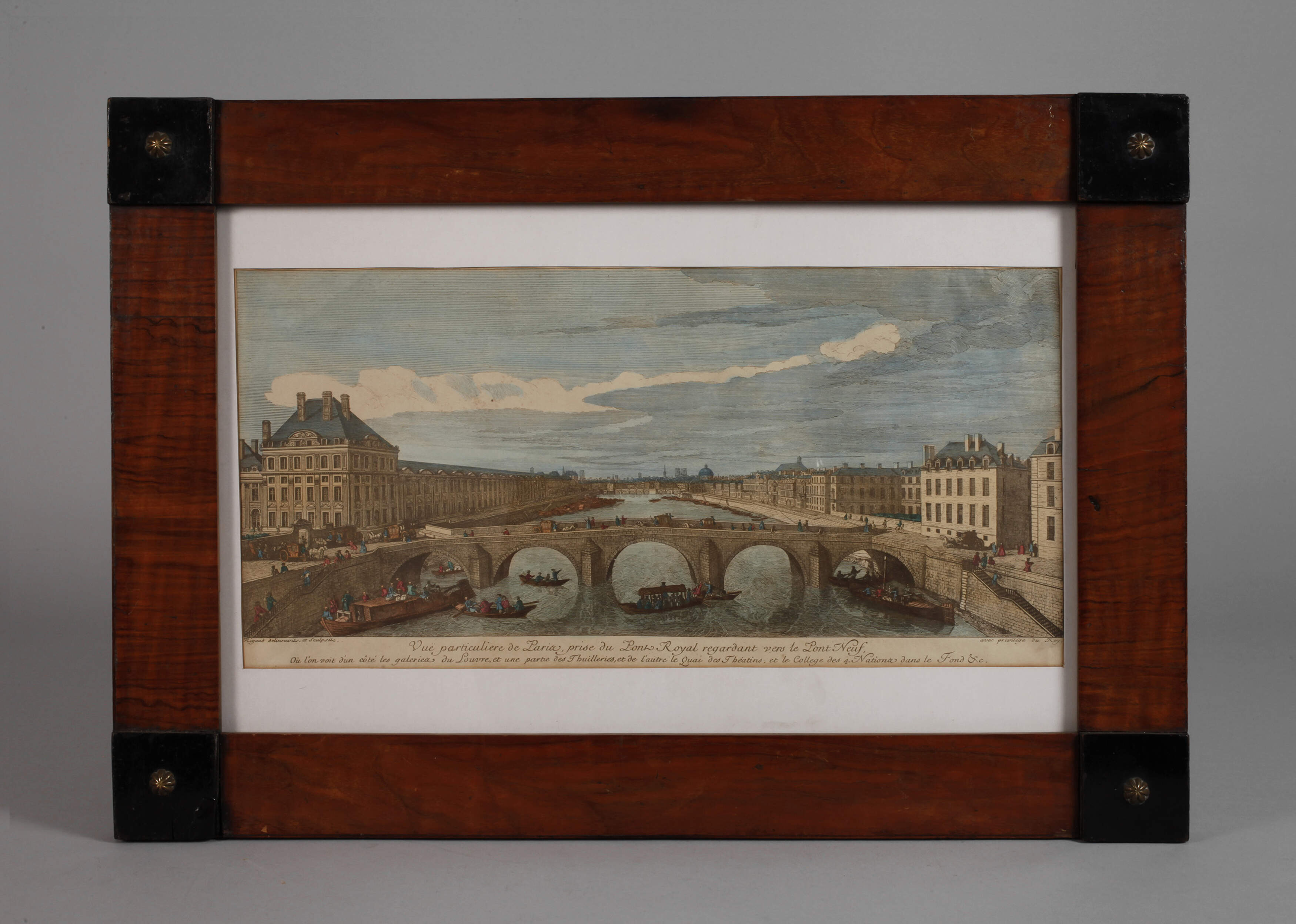 um 1820-30, Rahmen aus ca. 6 cm breiten, flachen und furnierten Holzleisten mit Eckquadraten und Applikationen, geringe Erhaltungsmängel, Falzmaße ca. 41 x 49,5 cm, beigegeben Druck hinter Glas.