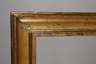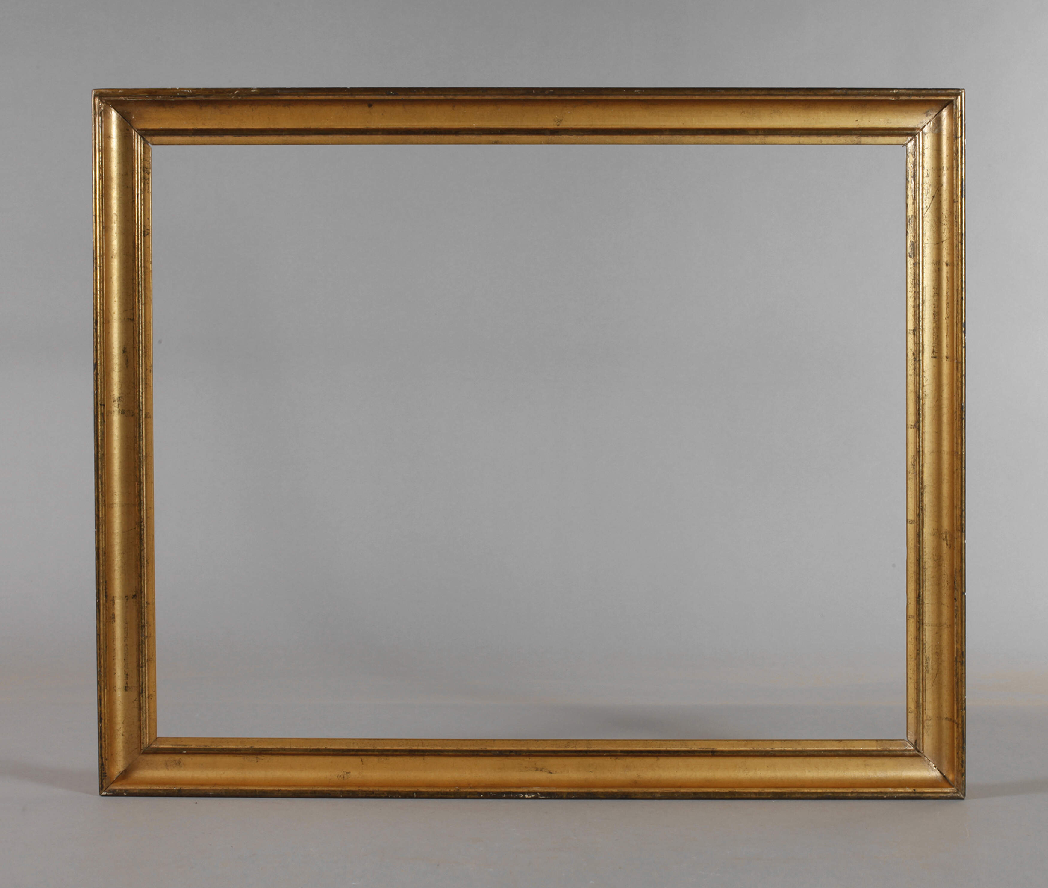 1. Hälfte 20. Jh., ca. 6 cm breite, gekehlte Waschgoldleiste, die Ecken auf Gehrung gesägt, Altersspuren, Farbfassung partiell übergangen, Falzmaße 71,5 x 56,5 cm.