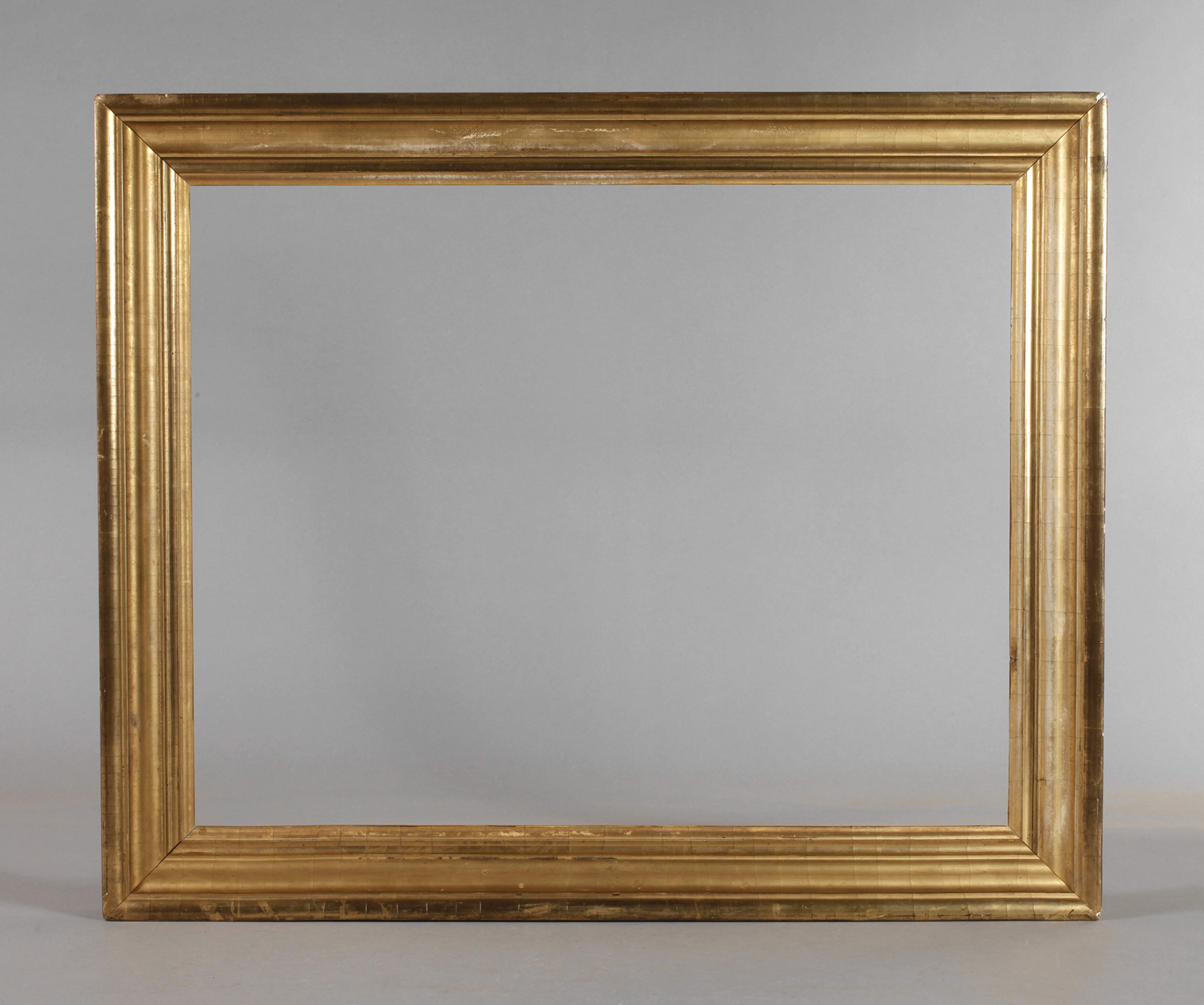 1. Hälfte 20. Jh., ca. 8 cm breite, aufsteigend profilierte Waschgoldleiste, Ecken geblattet und genagelt, ohne Wandaufhängung, Craquelue, minimale partiell ausgebesserte und übergangene Fehlstellen, Falzmaße 68,5 x 54 cm.