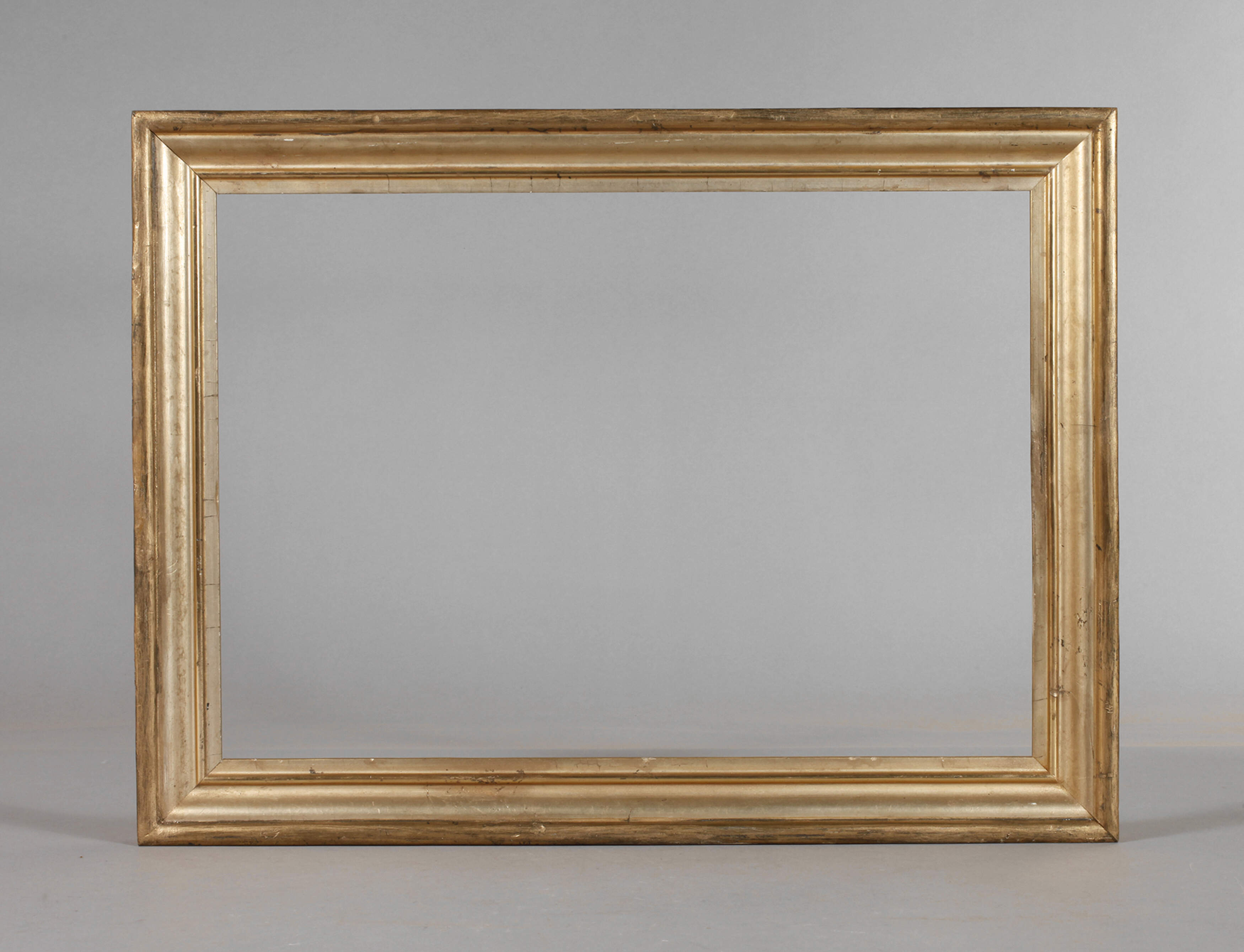 2. Hälfte 20. Jh., ca. 5 cm breite, flach gekehlte Profilleiste, Farbfassung partiell übergangen, Ecken auf Gehrung gesägt, Altersspuren, Falzmaße 52,5 x 36,5 cm.