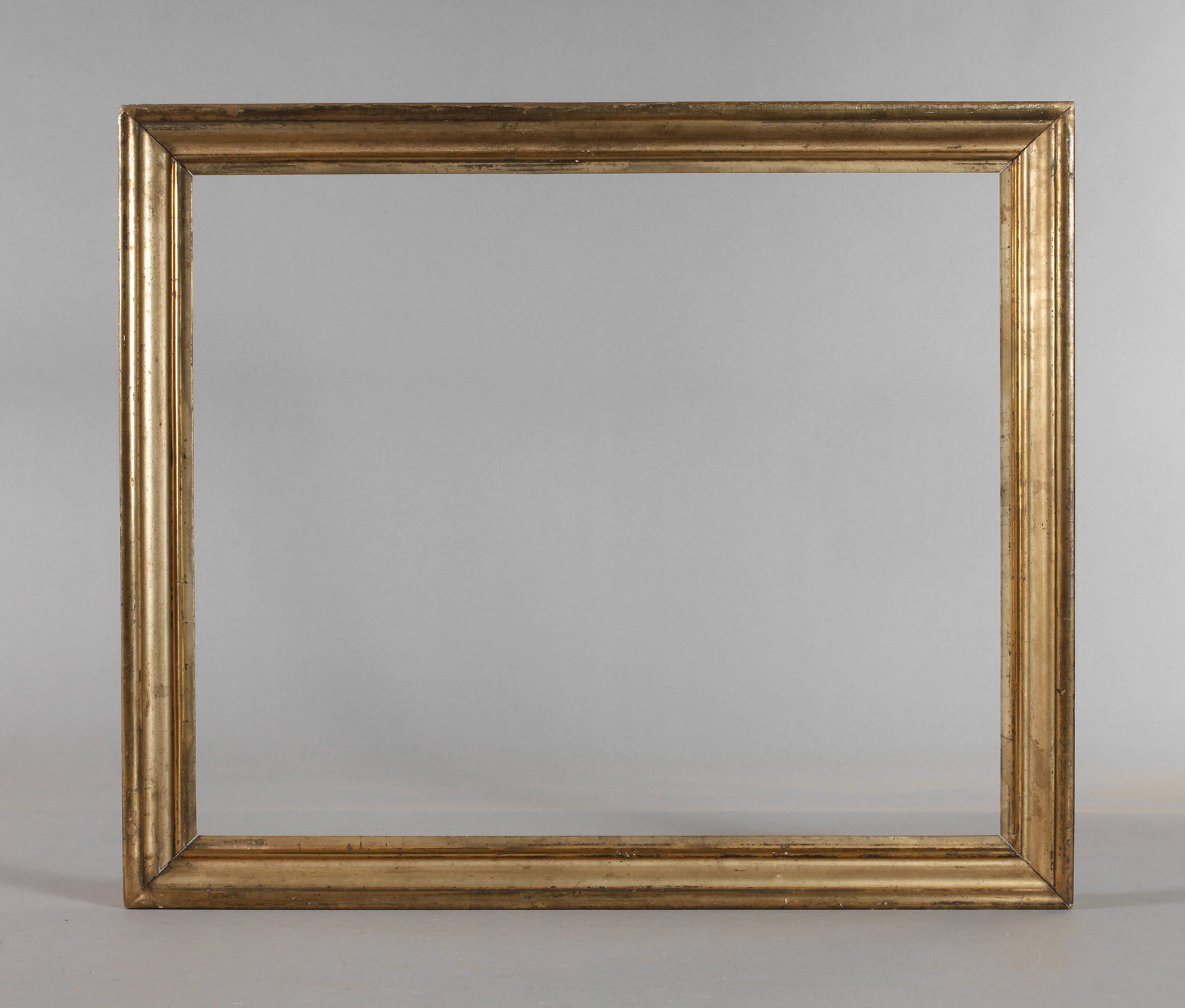 Anfang 20. Jh., ca. 6 cm breite, aufsteigend profilierte, partiell polierte Waschgoldleiste, die Ecken auf Gehrung gesägt, Farbfassung partiell übergangen, Altersspuren, Falzmaße 61 x 50,5 cm.