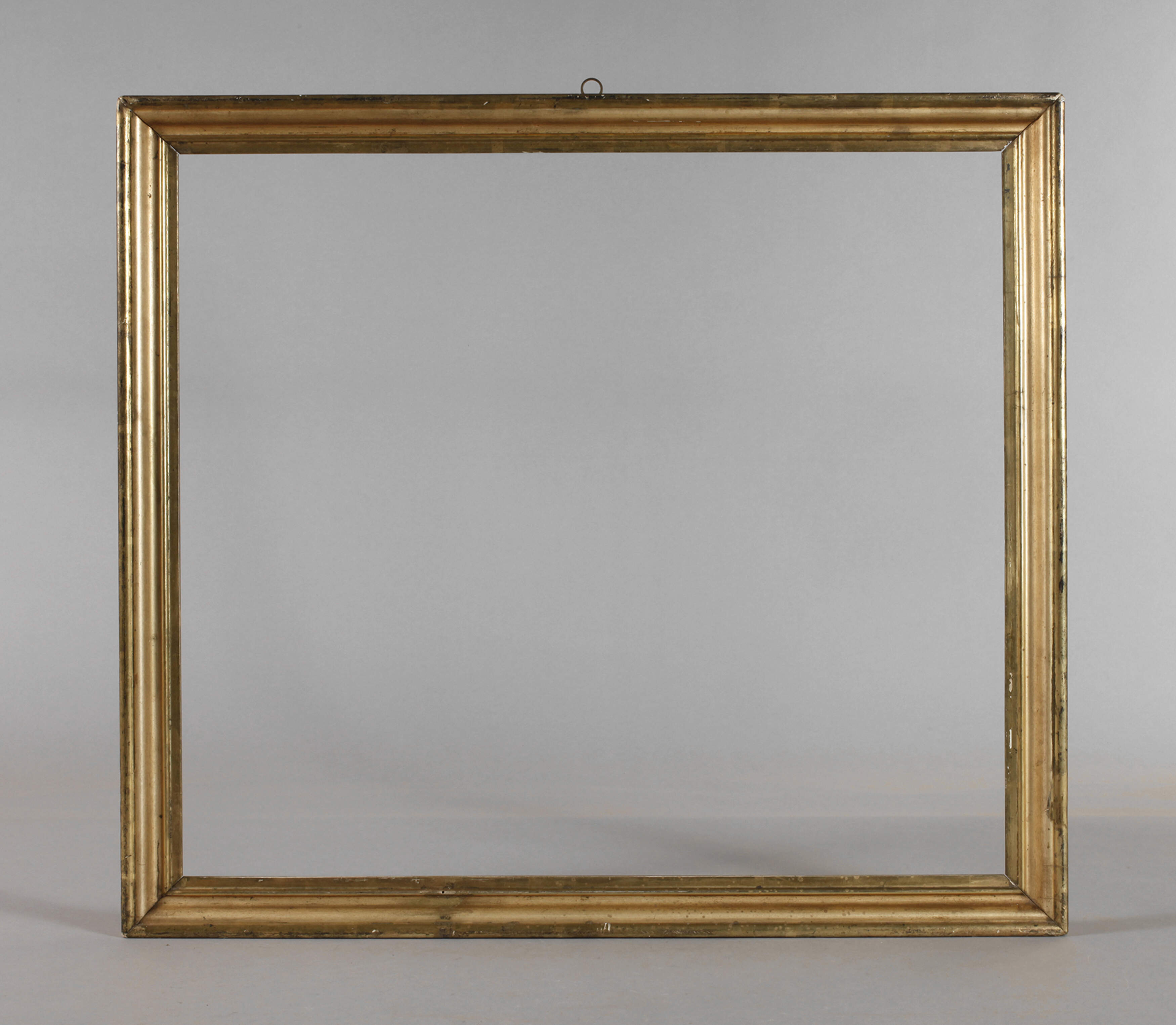 20. Jh., ca. 5 cm breite, nach außen aufsteigend profilierte Waschgoldleiste, die Ecken auf Gehrung gesägt, Alters- und Gebrauchsspuren, Falzmaße 56 x 63,5 cm.