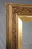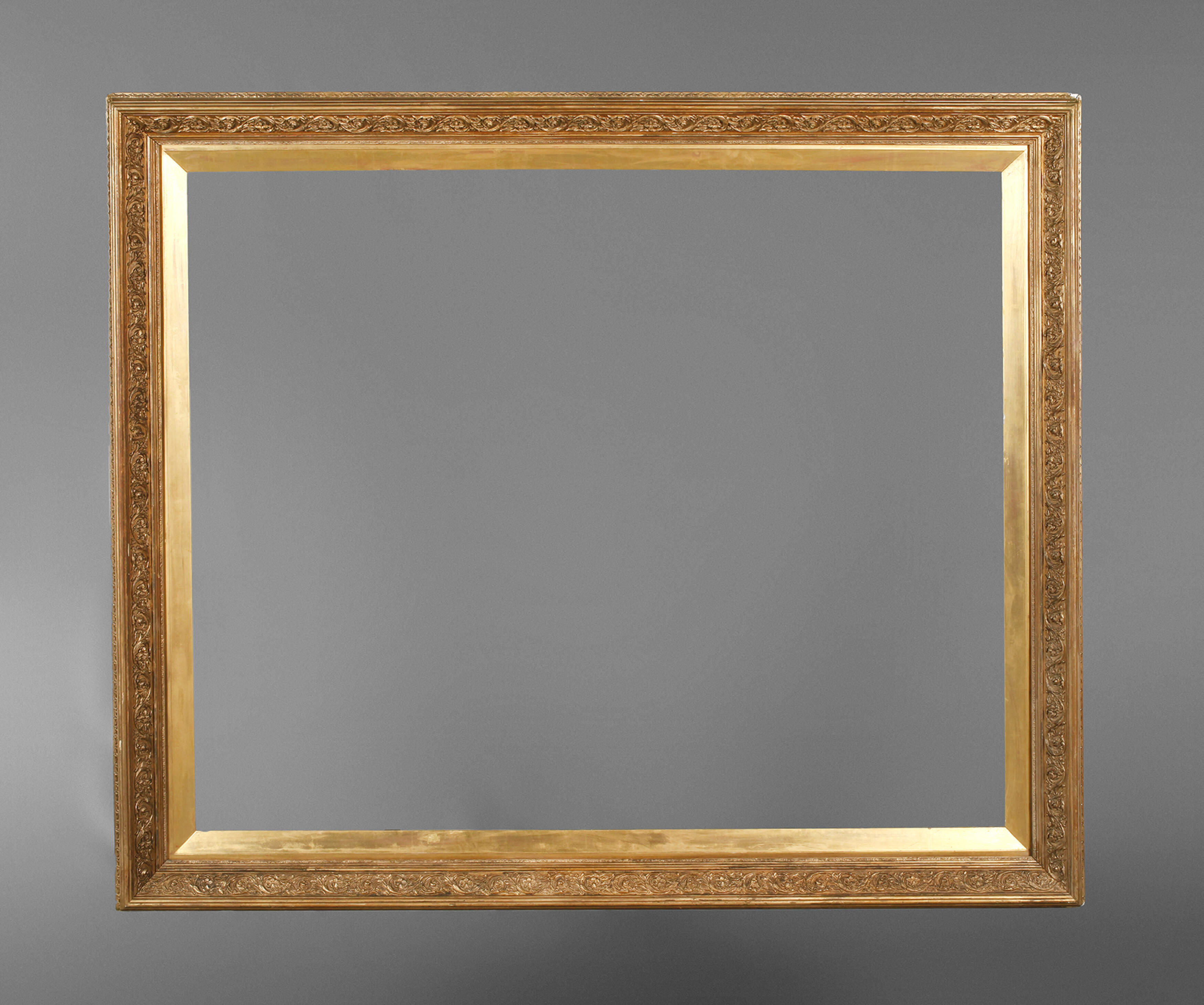2. Hälfte 19. Jh., ca. 14 cm breite, aufsteigend profilierte, mit reliefiertem Akanthusblattdekor, Akanthusstab sowie Rillenbändern verzierte Leiste, die umlaufenden Floralismen als Voluten geformt, innen nachträglich angebrachte facettierte Profilleiste, die Ecken auf Gehrung gesägt, blattvergoldet und goldbronziert, eine Ecke mit kleiner Fehlstelle, wenige Ausbesserungen, insgesamt jedoch guter Zustand mit Alters- und Gebrauchsspuren, Falzmaße 110,5 x 135,5 cm.
