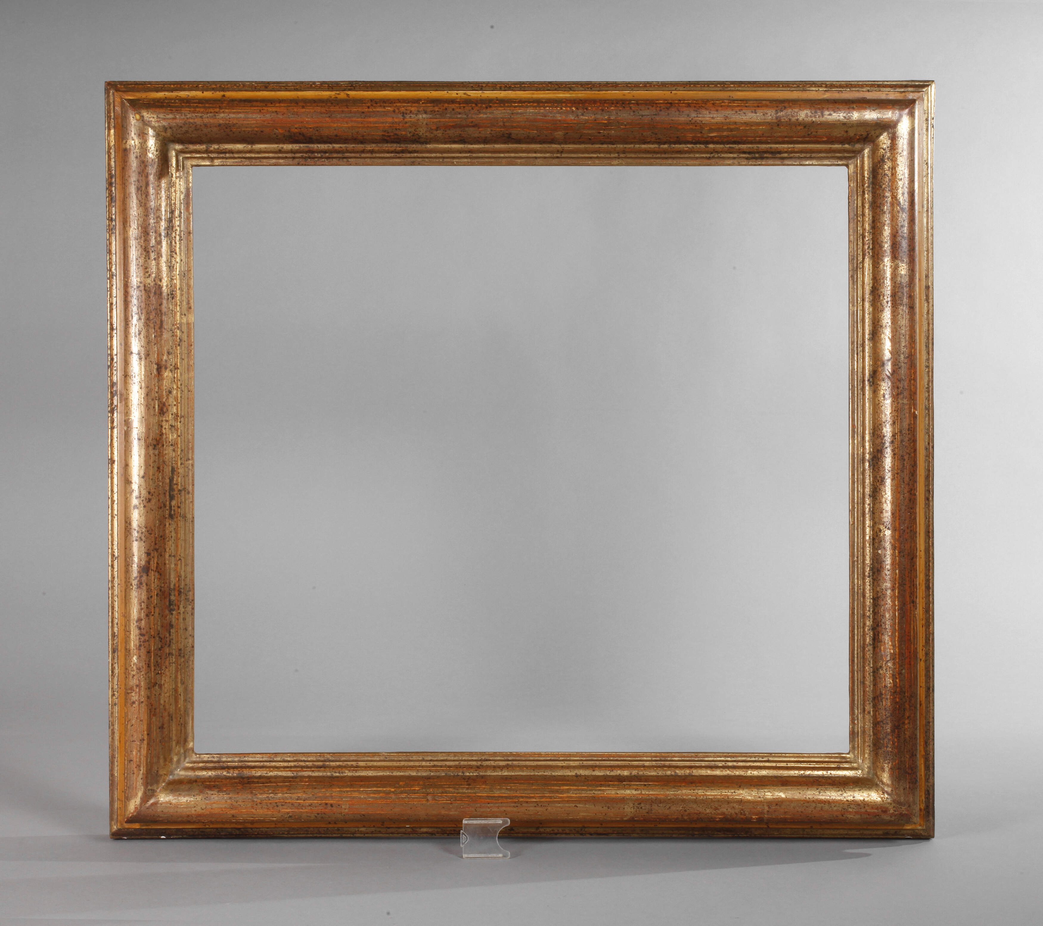 Mitte 20. Jh., aus ca. 9 cm breiter, zur Rahmenmitte steigend profilierter, rot grundierter, goldbronzierter beziehungsweise ocker gefasster und antikisierender Holzleiste, Gehrungen geschnitten, verplatteter Blendrahmen mit Eckverstrebung, minimale Bestoßungen, Falzmaße ca. 70 x 64 cm.