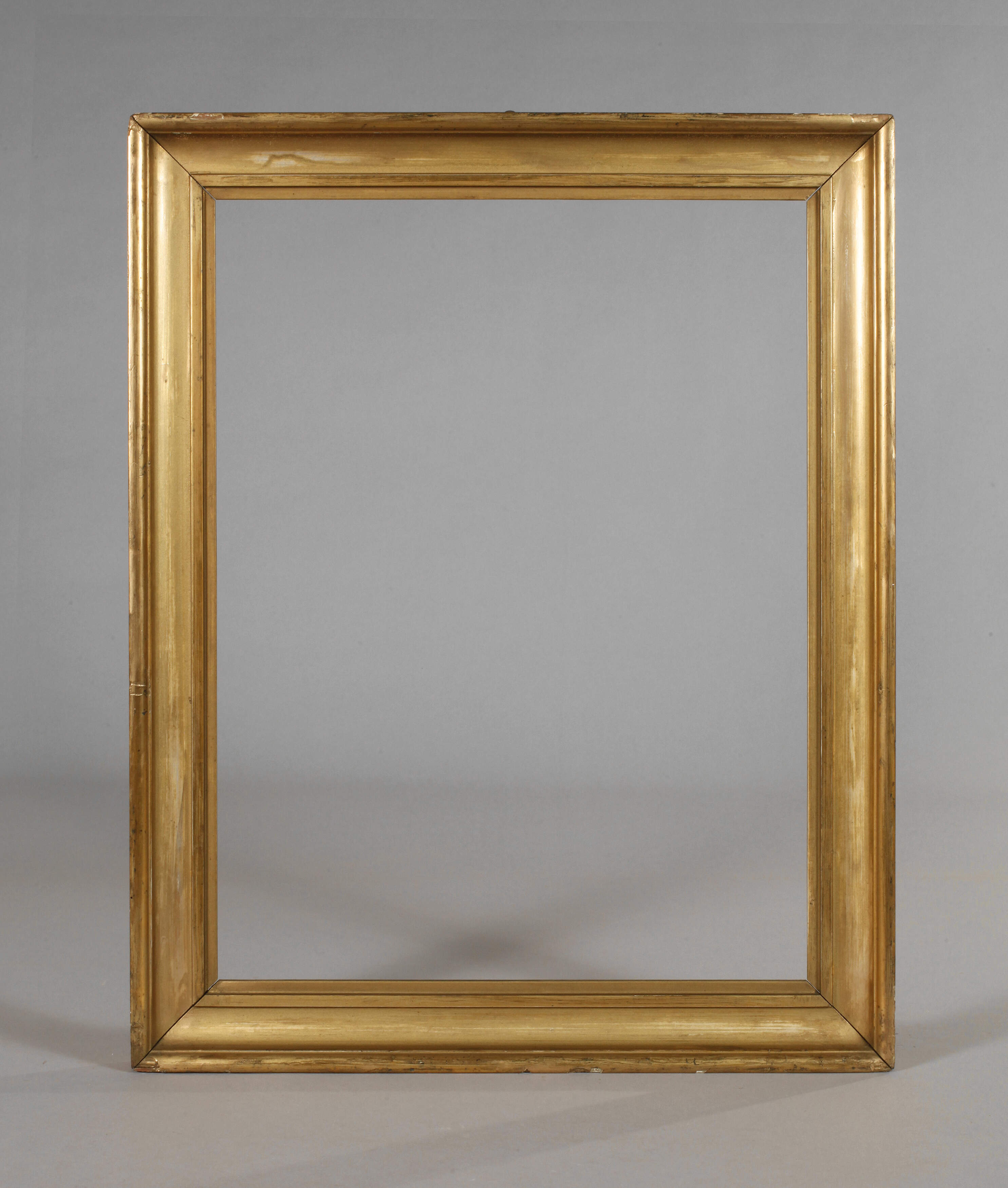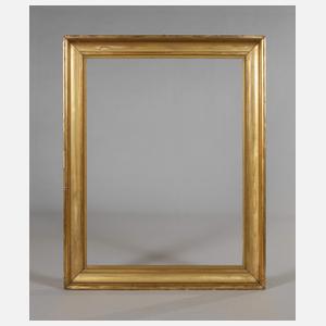 Mitte 19. Jh., ca. 6,5 cm breite, aufsteigend profilierte, grundierte, versilberte und patinierte Holzleiste, Gehrung gesägt, Farbfassung übergangen, kleinere Verluste, Falzmaße ca. 65,5 x 50,5 cm.