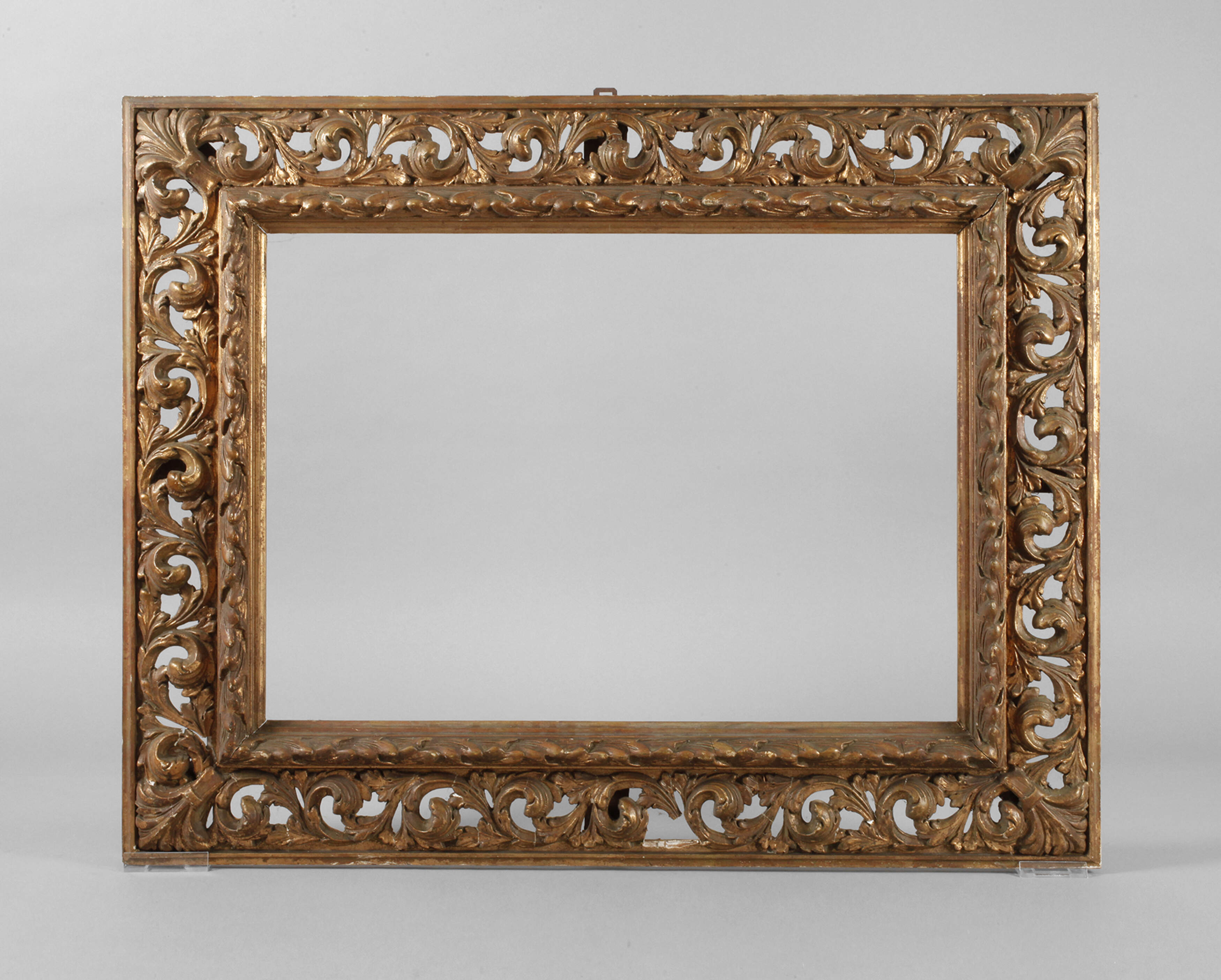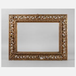 um 1900, ca. 13 cm breiter, aufwendig geschnitzter und durchbrochen gearbeiteter Rahmen, gestuckt und vergoldet auf rotem Bolus, reliefierte Innenleiste, rückseitig verstrebt, stärkere Altersspuren und nicht komplett, restaurierungsbedürftig, Falzmaße 62 x 44 cm.