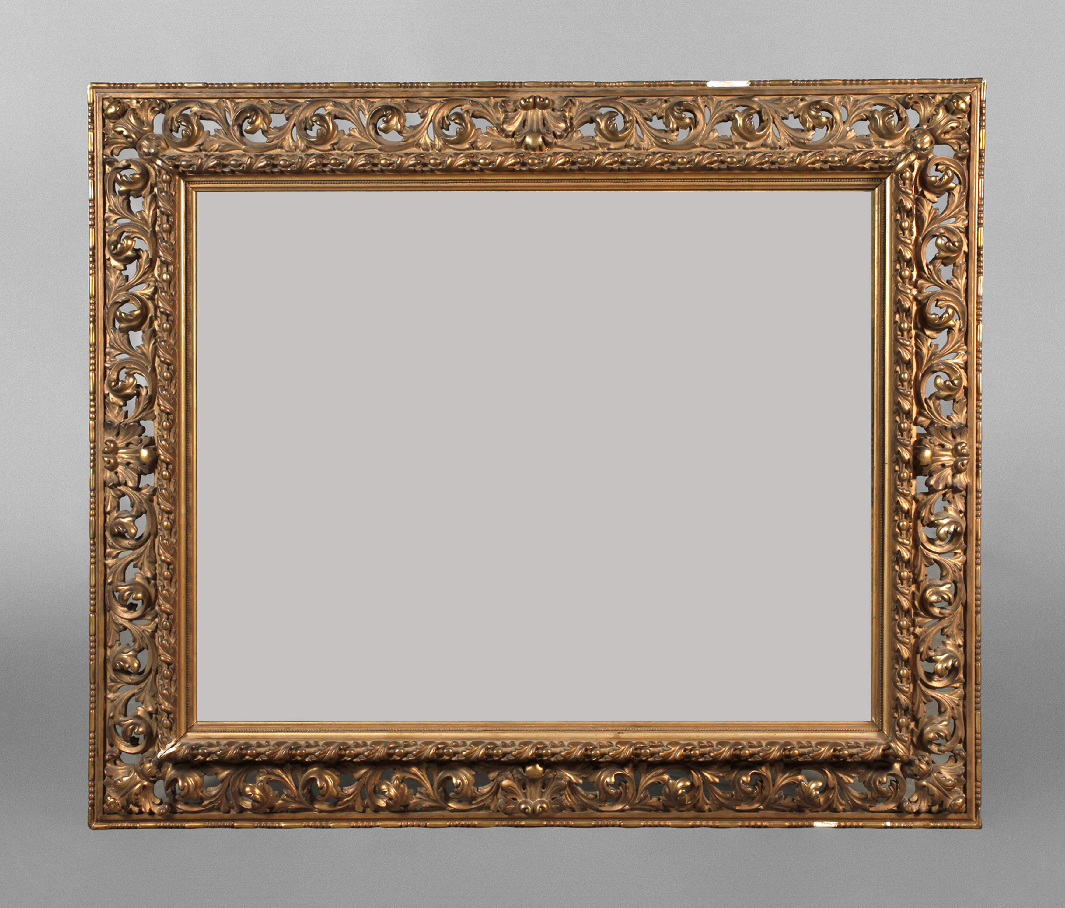 um 1900, Rahmen aus ca. 13,5 cm breiter, durchbrochen gearbeiteter, mit Akanthusranken und Perlstäben verzierter vergoldeter Holzleiste, Gehrungen über Eck gearbeitet, Erhaltungsmängel, Falzmaße ca. 70 x 88,5 cm, beigefügt Ölgemälde einer Gebirgslandschaft.
