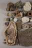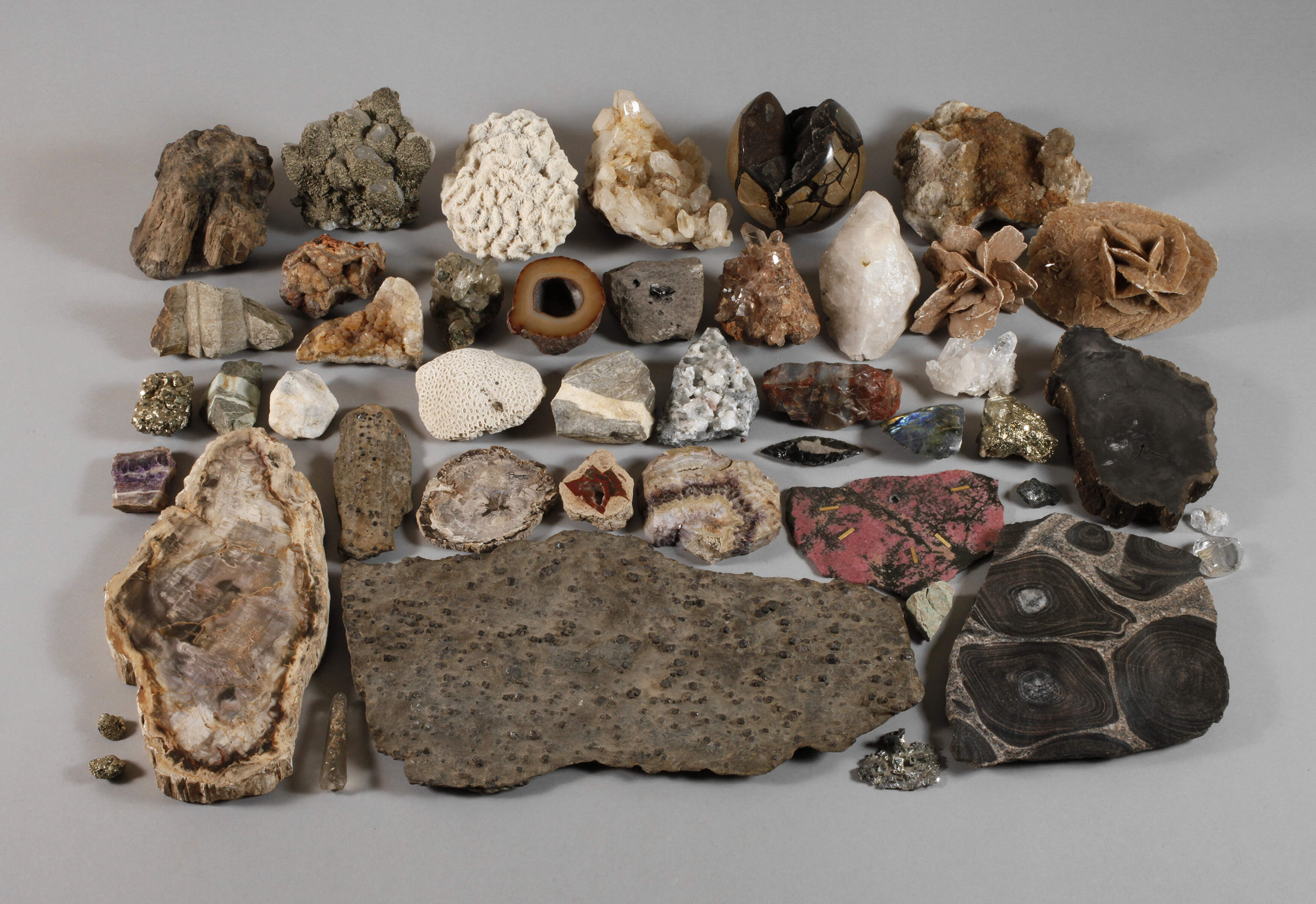 unbestimmten Alters, ca. 45 unterschiedliche Kristalle, Gesteine und Fossilien, darunter Rosenquarz, Bergkristall, versteinerte Baumscheibe, Sandrose, Labradorit, Pyrit, Granat etc., in zwei Kartons, L max. 56 cm.