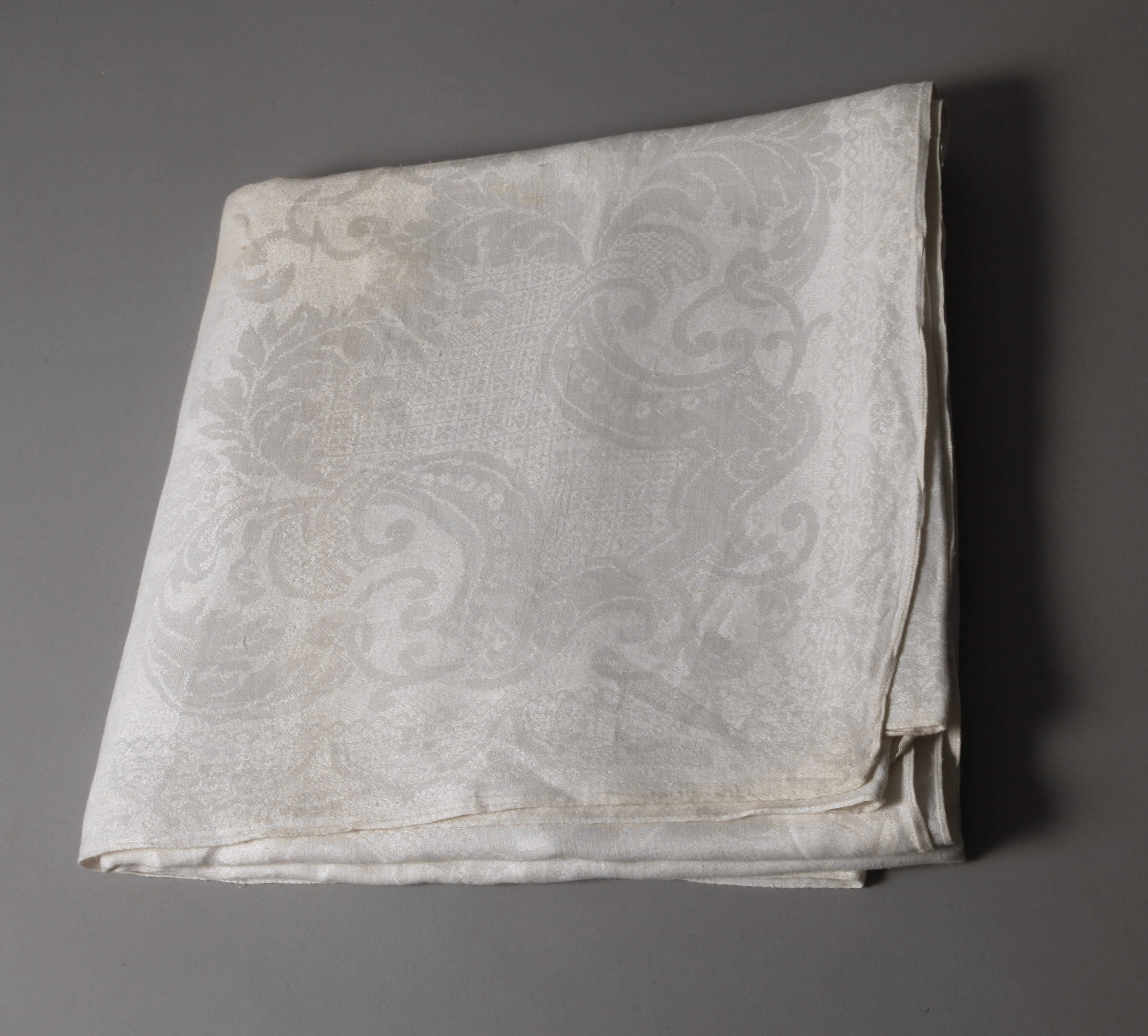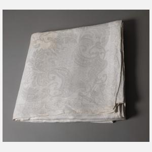 2. Hälfte 19. Jh., feiner weißer Leinendamast mit eingewebtem Dessin aus großen Blüten und Rollwerk als breite umlaufende Bordüre mit Kartuschenmotiv in den Ecken sowie als drei große axialsymmetrische Medaillons im Mittelfeld, kleines gesticktes Besitzermonogramm J.W. 1 in Rot, guter altersgemäßer Zustand mit minimalstem Fadenzug und partiell leichten Flecken, Maße 310 x 150 cm.